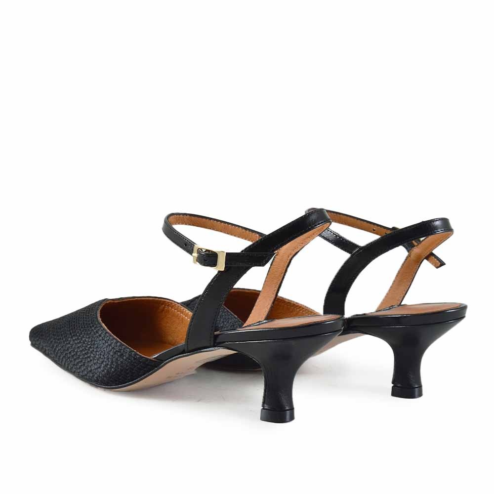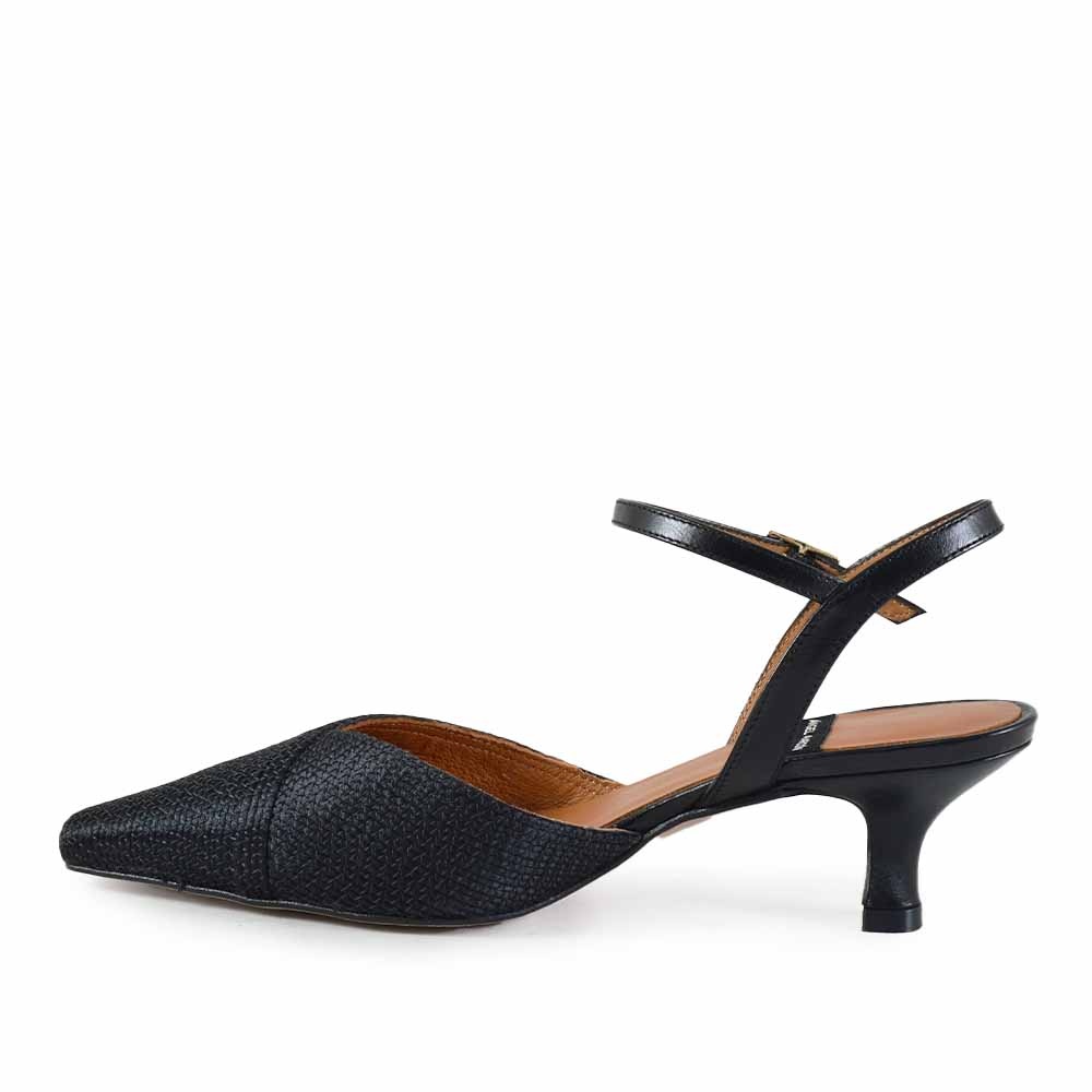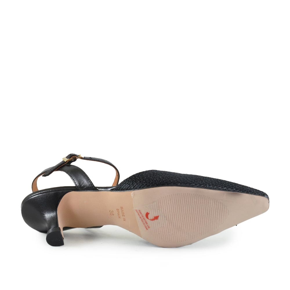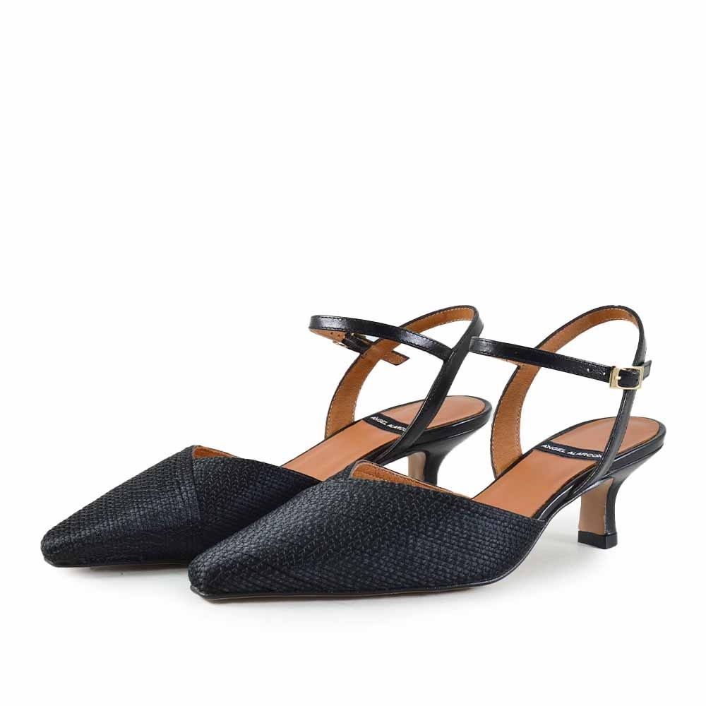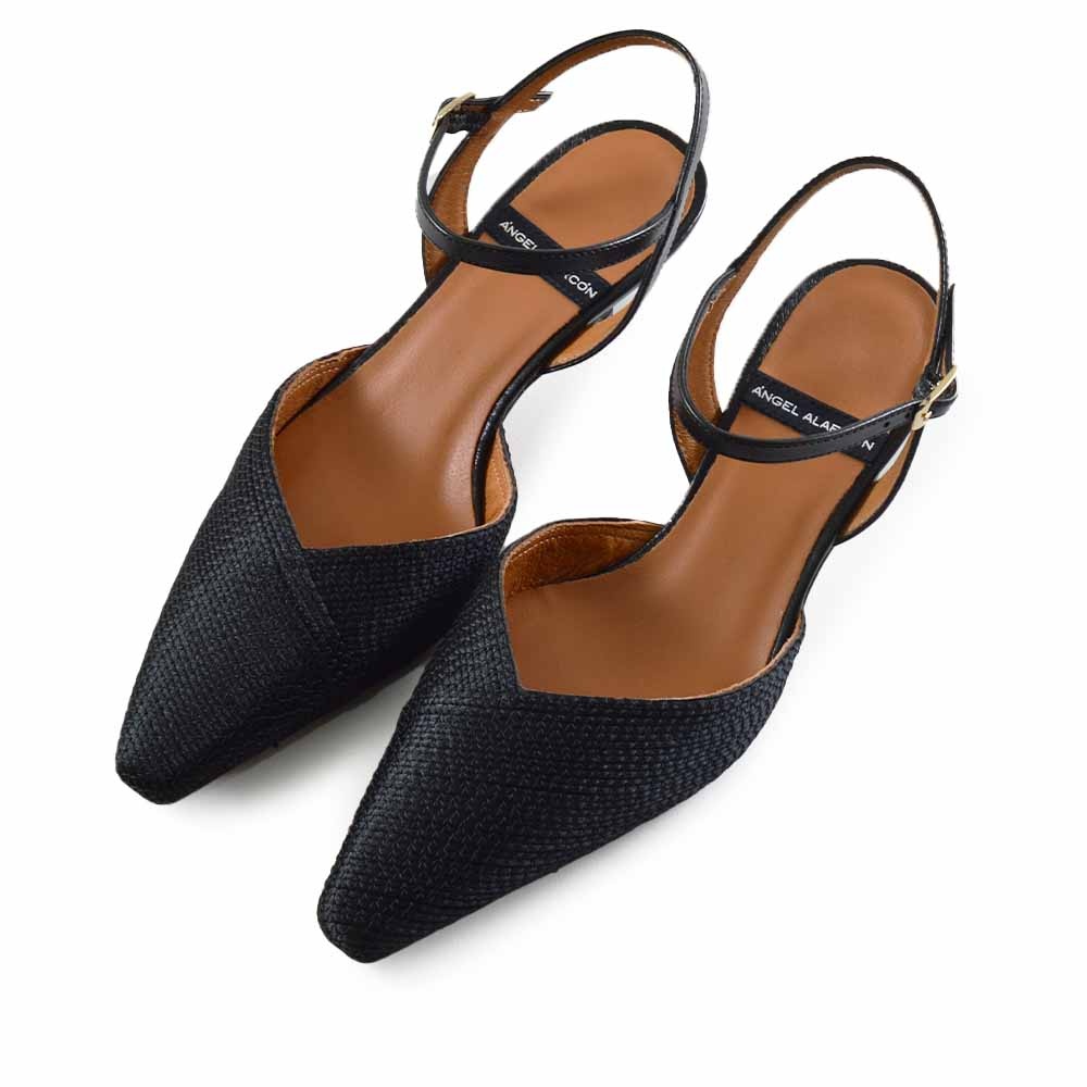 De Angel Alarcon 26021 is een elegante zwarte dames schoen met een verfijnde en moderne uitstraling. Deze stijlvolle slingback combineert een spitse neus met een subtiel raffia detail, wat zorgt voor een zomerse en luchtige look. Perfect voor vrouwen die op zoek zijn naar een veelzijdige schoen voor zowel werk als vrije tijd.