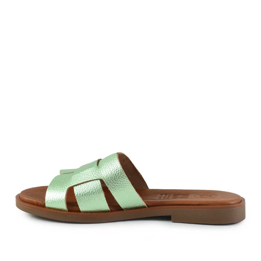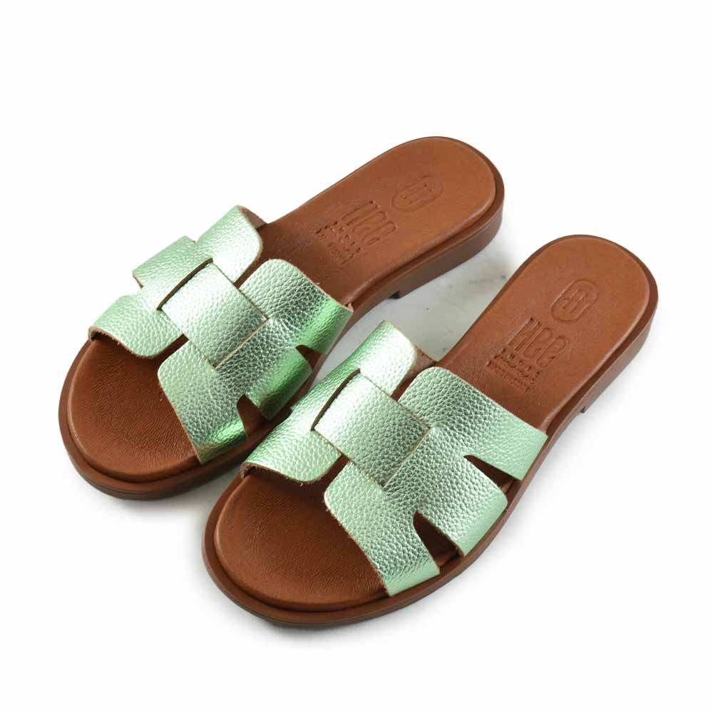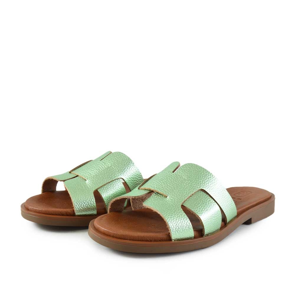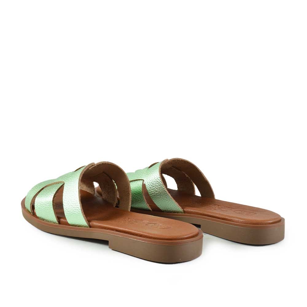 Hee 26320 Lichtblauw dames slipper met metallic lichtblauw en groen leer. Leren binnenvoering, comfortabel en stijlvol, perfect voor de zomer.