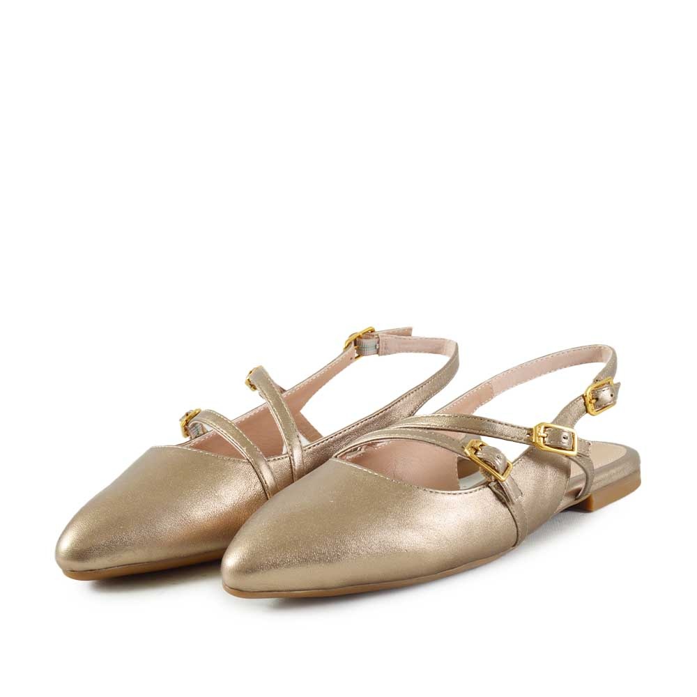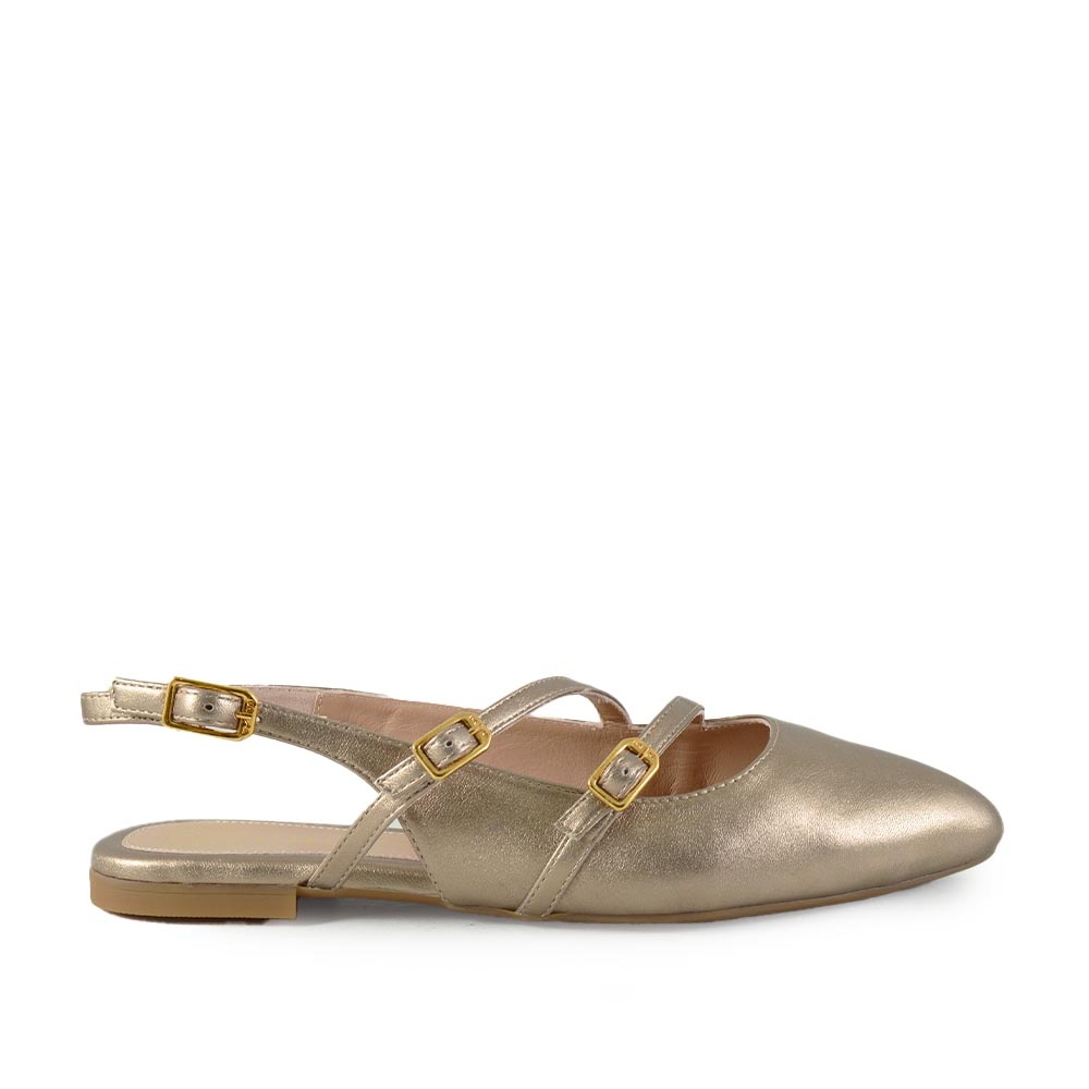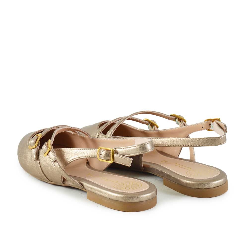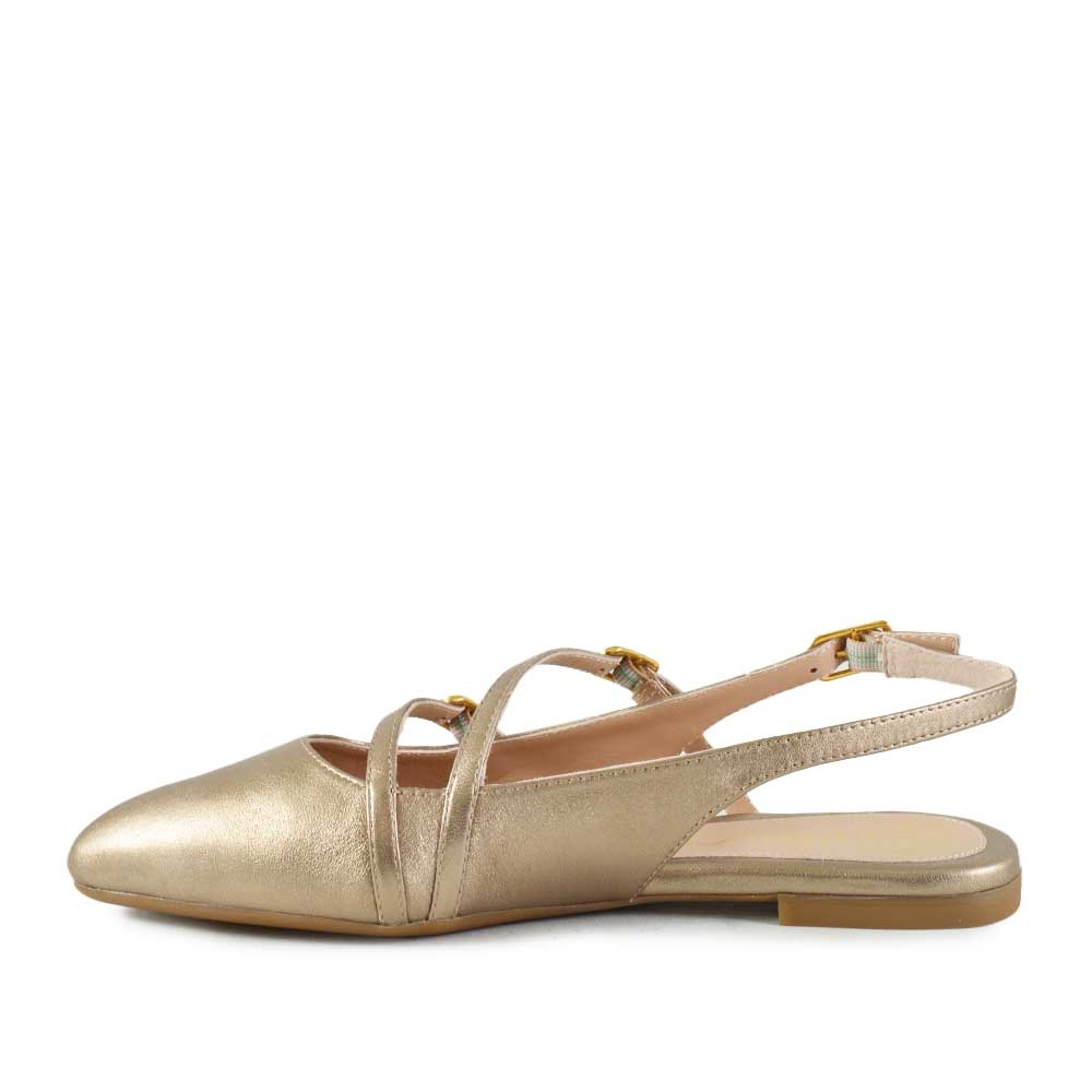 De lage hak en het open hielontwerp zorgen voor ultiem draagcomfort op warme dagen. Dankzij de zachte leren voering voelt deze ballerina heerlijk aan je voet en is hij geschikt voor langdurig dragen. De verstelbare gouden bandjes bieden niet alleen een chique accent, maar zorgen ook voor een perfecte pasvorm.