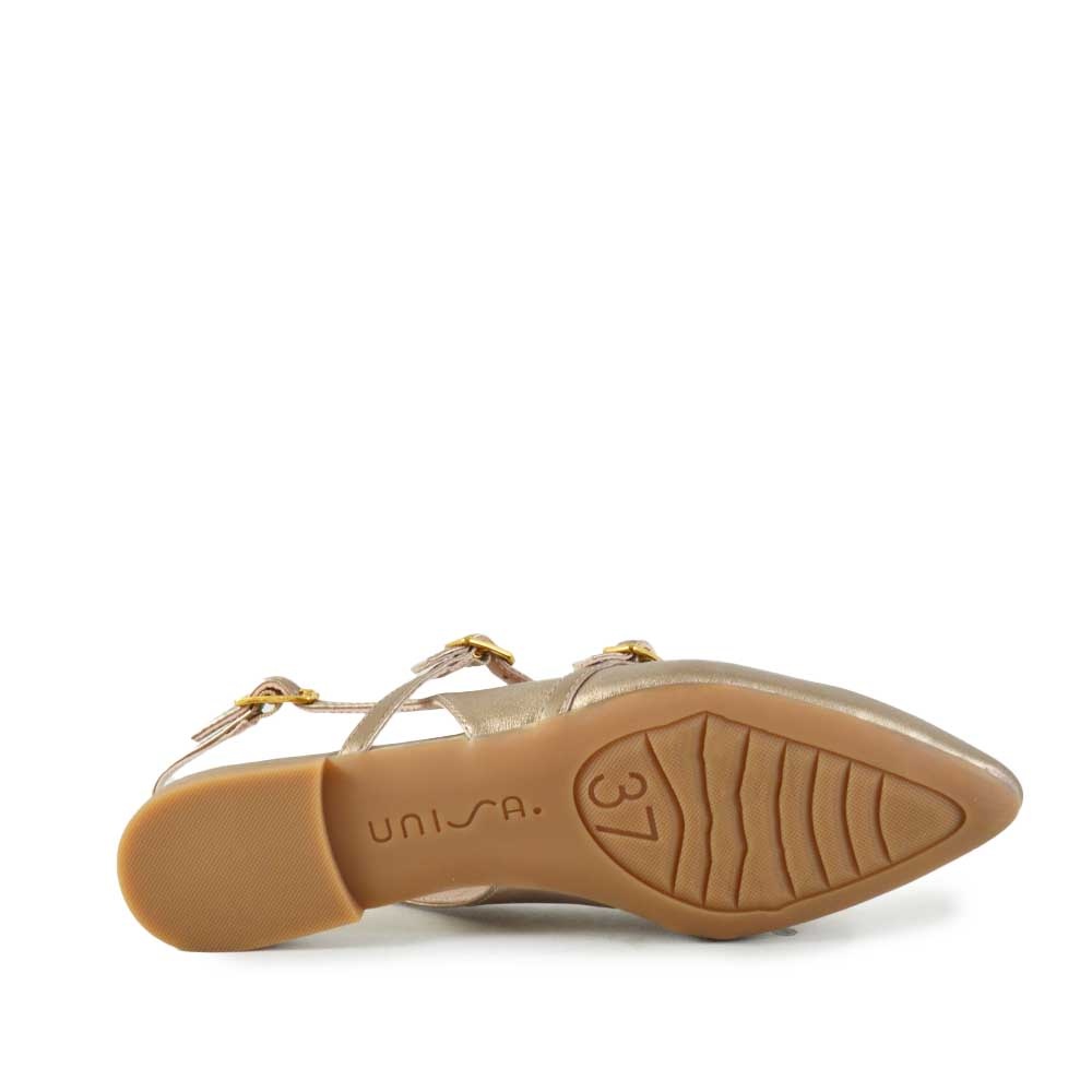 De Unisa Alsip Brons is een elegante leren slingback ballerina die jouw zomerse outfit direct naar een hoger niveau tilt. Deze lage dames instapper is uitgevoerd in een stijlvolle bronzen kleur en voorzien van verfijnde gouden gespjes en bandjes over de wreef. Een perfecte combinatie van vrouwelijkheid en verfijning.