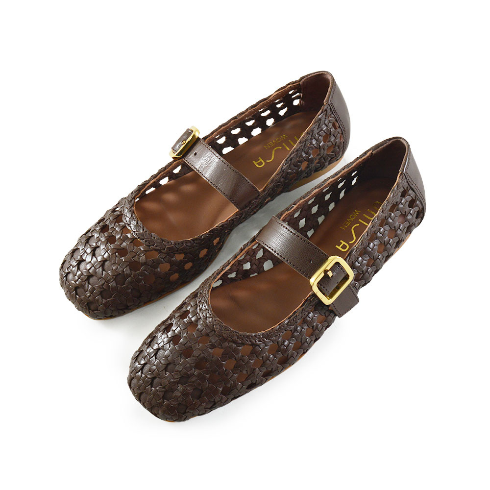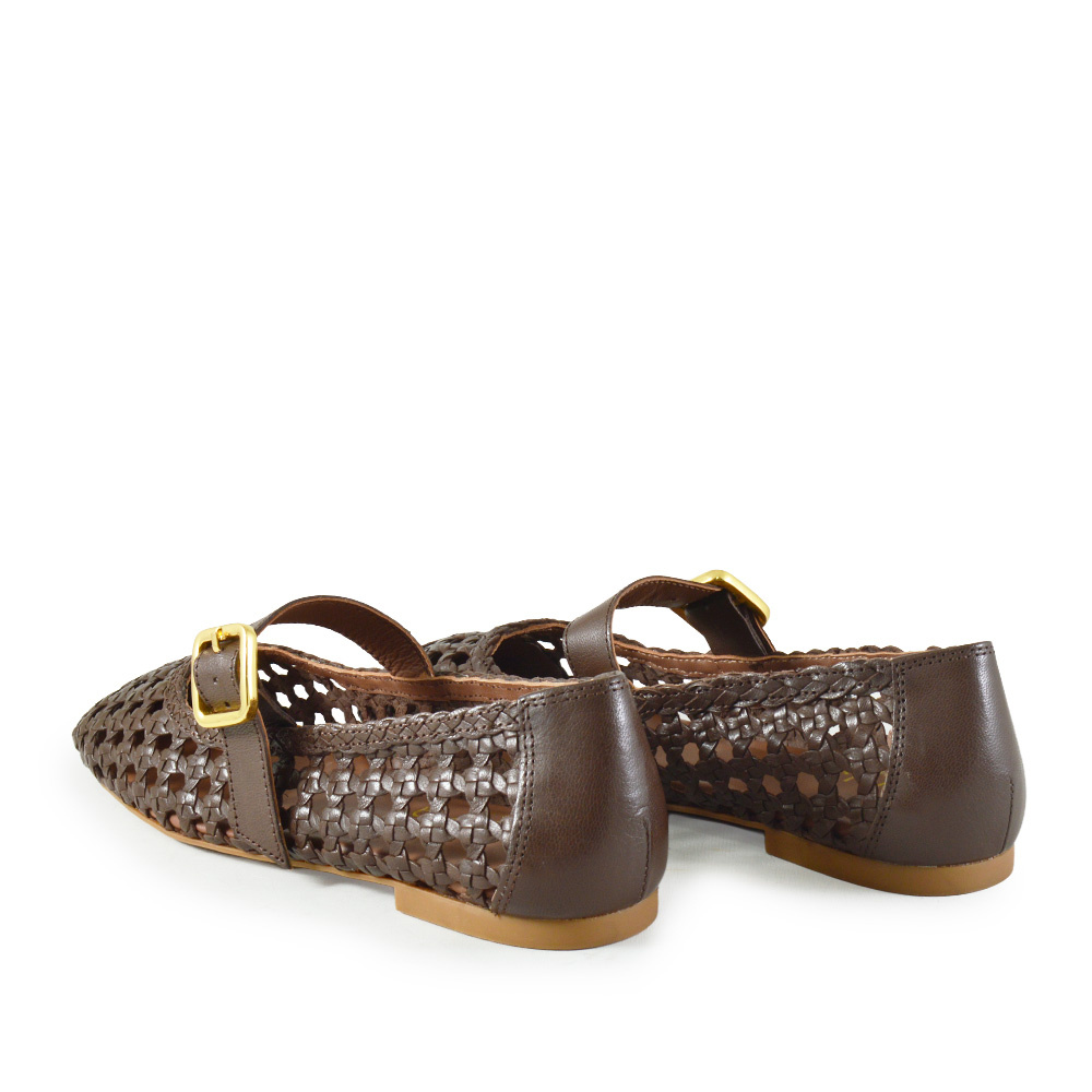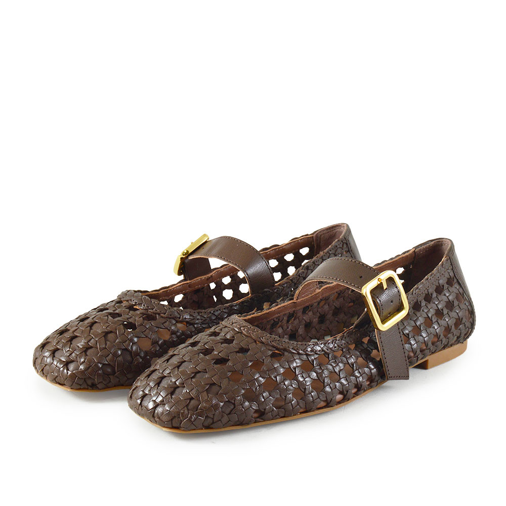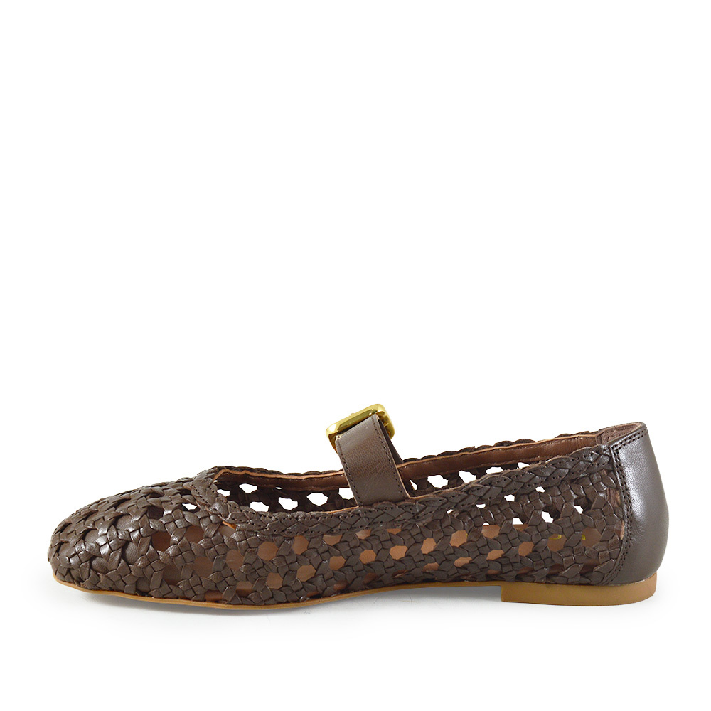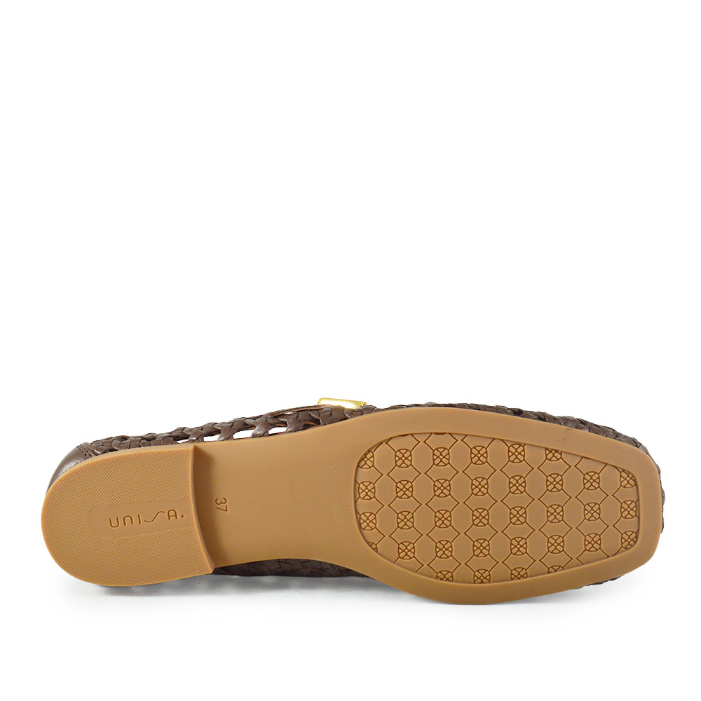 Unisa Balza bruine ballerina met open vlechtleer en gesp. Lichte en stijlvolle zomerschoen met dunne zool en perfecte pasvorm.