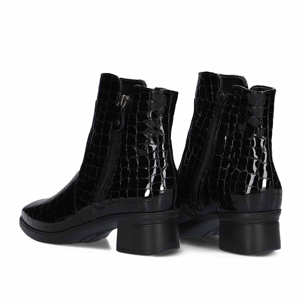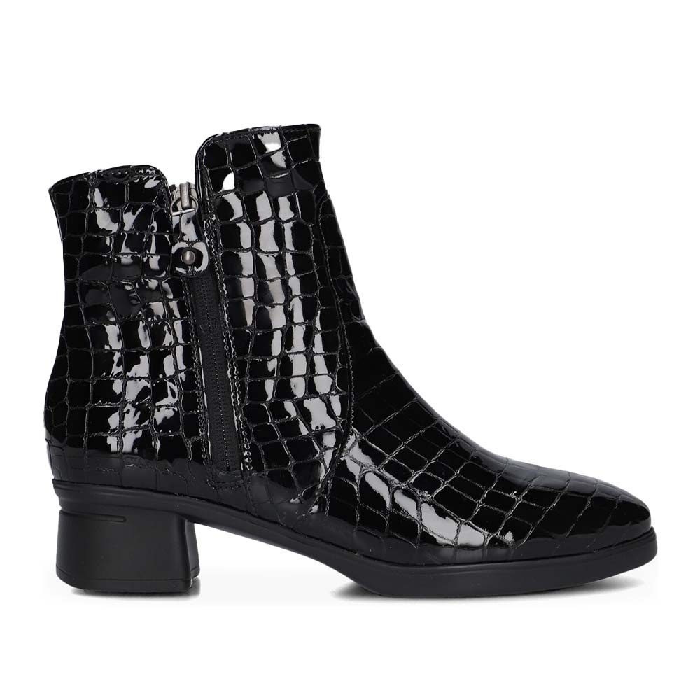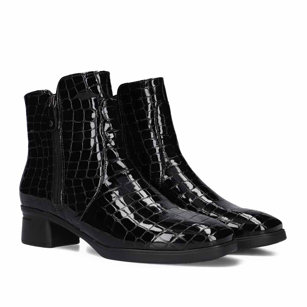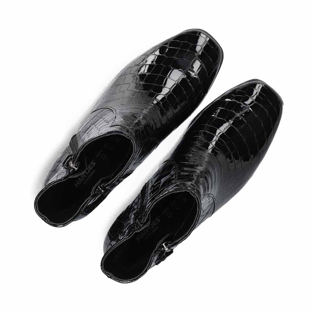 Deze Hartjes Blues Boot Lak Zwart is een stijlvol en modieus dames enkellaarsje, vervaardigd uit hoogwaardig croco lakleer. Deze laars voegt direct een chique touch toe aan elke outfit. De glanzende afwerking in combinatie met het krokodillenreliëf maakt dit een echte eyecatcher.