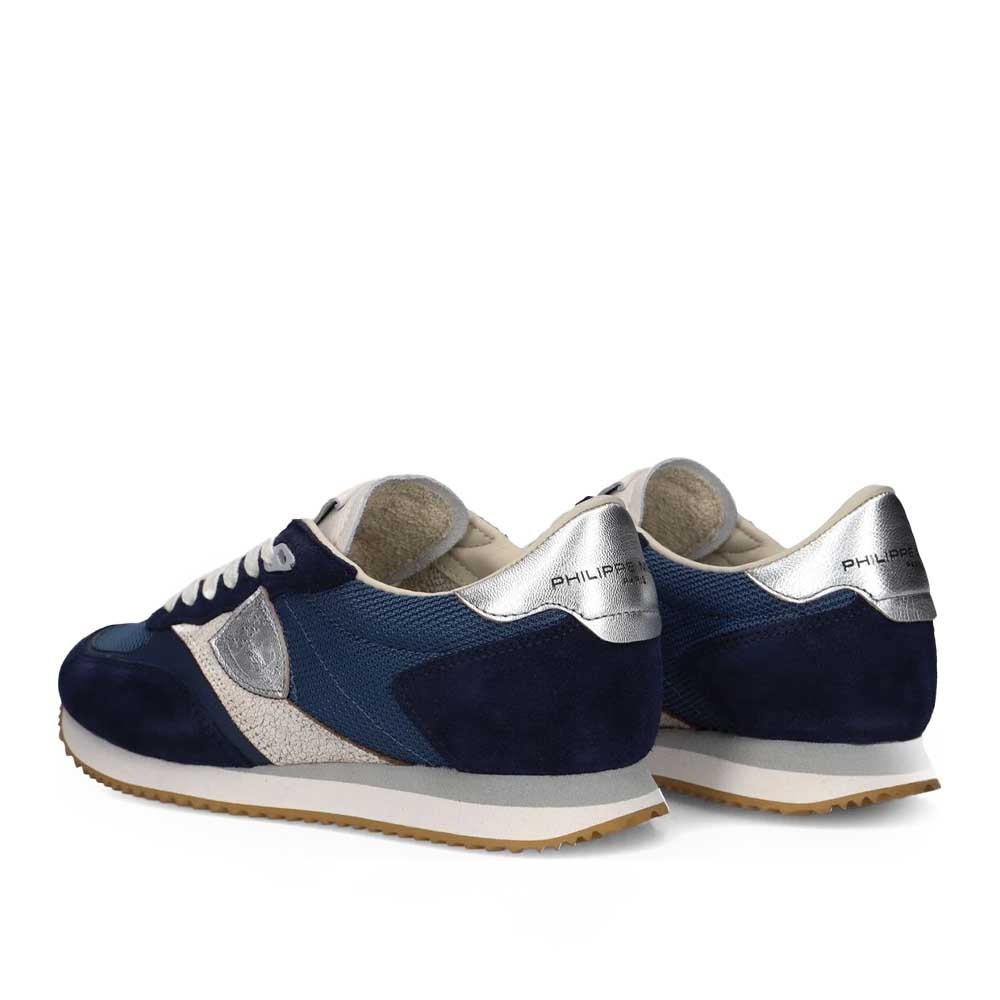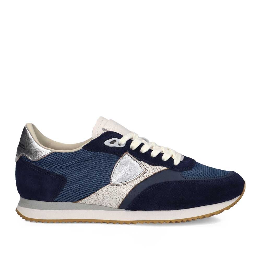 Philippe Model BLVille Low Blauw dames sneaker, frisse zomerse look, zilver logo, handgemaakt in Italië, uitneembaar voetbed, comfortabele runner zool.