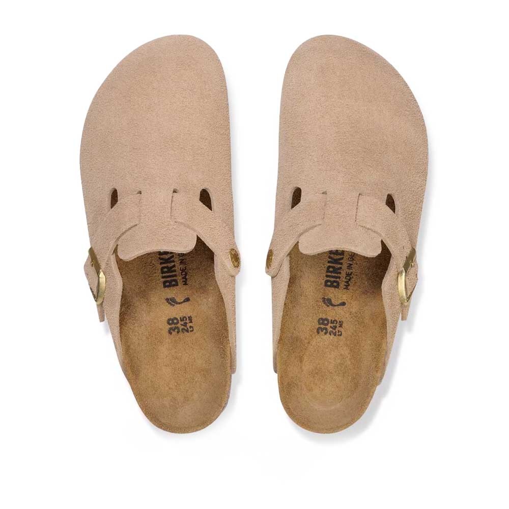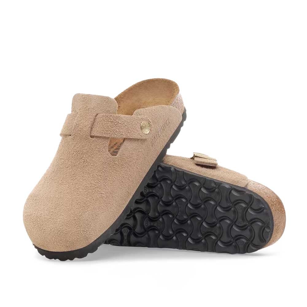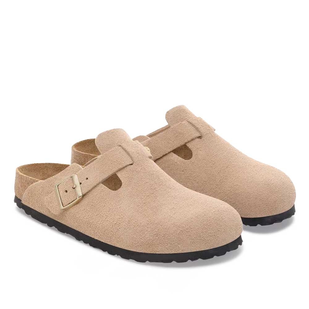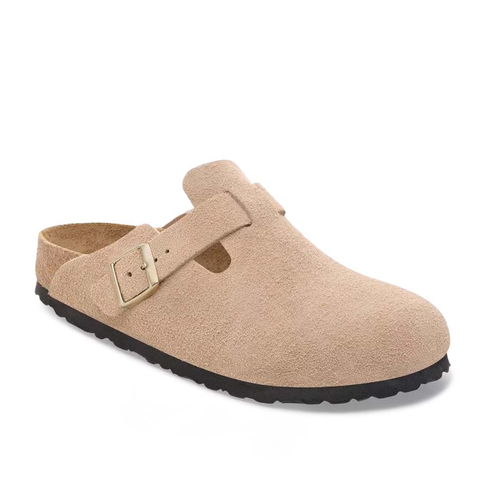 De Birkenstock Boston Taupe suede dames muil is een iconische klassieker die elke garderobe verrijkt. De modieuze taupe kleur vormt de perfecte basis voor elke outfit en elk seizoen. Het luxueuze suède en de verfijnde gouden gesp geven deze muil een elegante en trendy uitstraling waar je moeiteloos mee voor de dag komt.