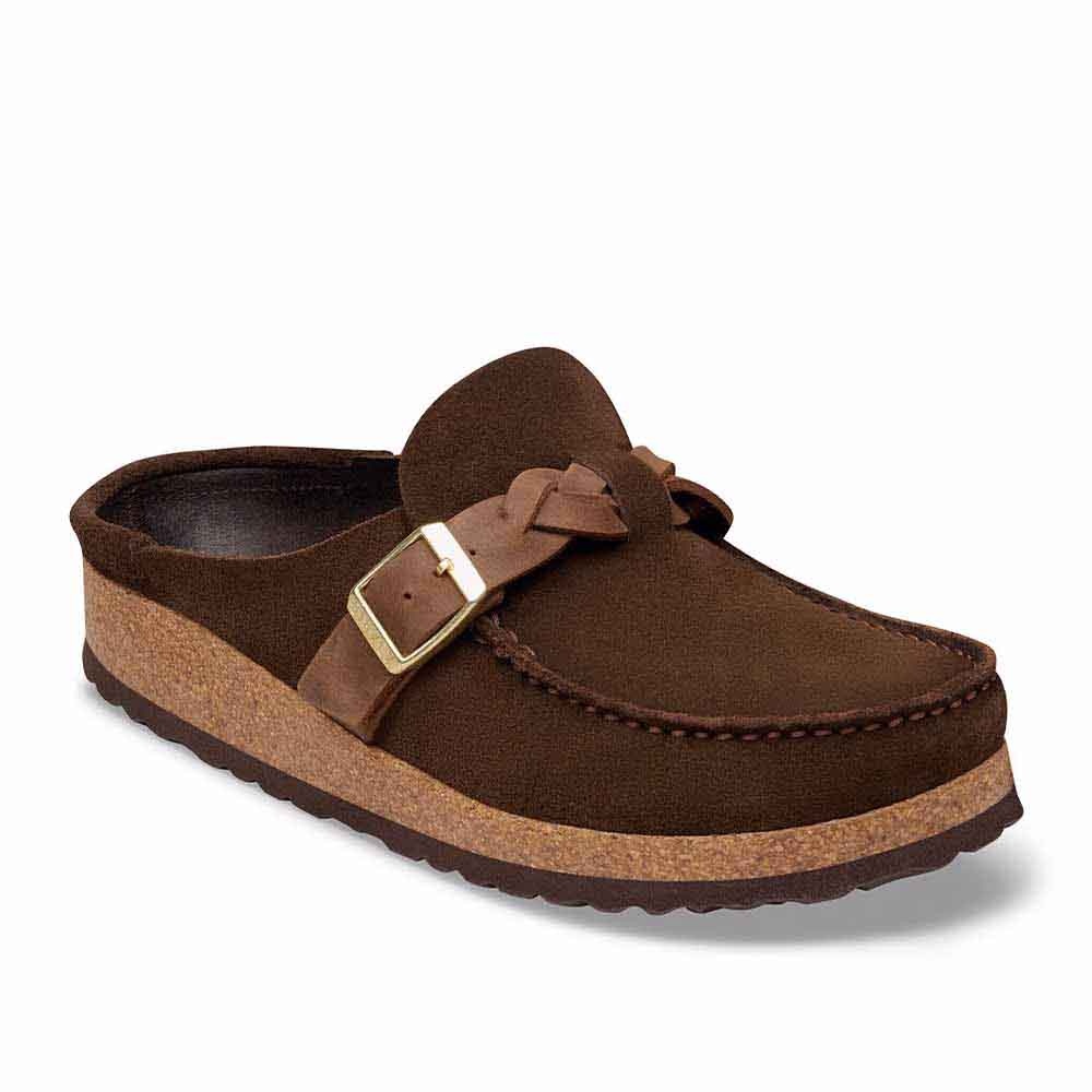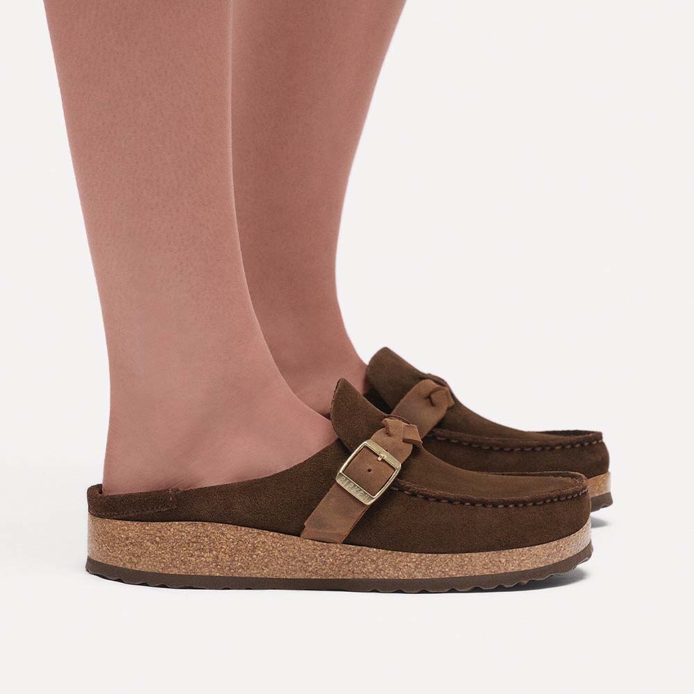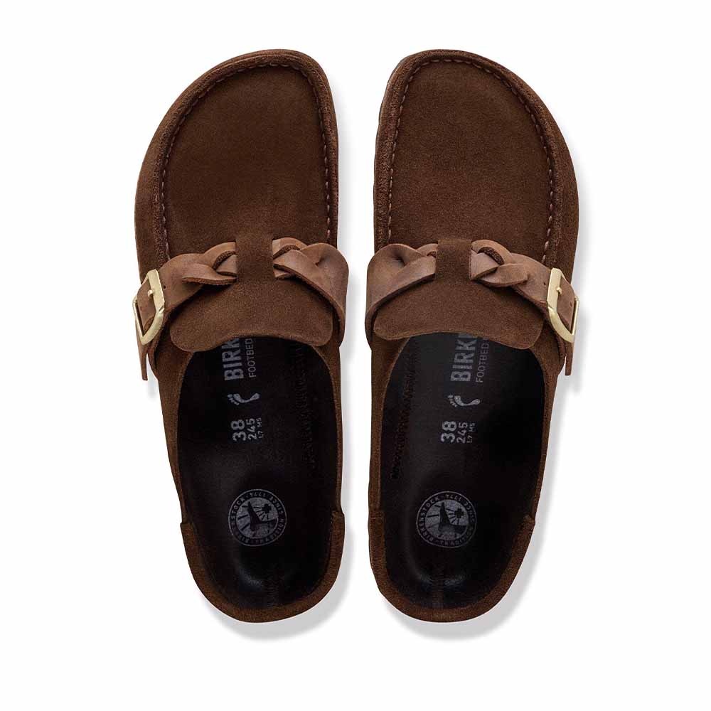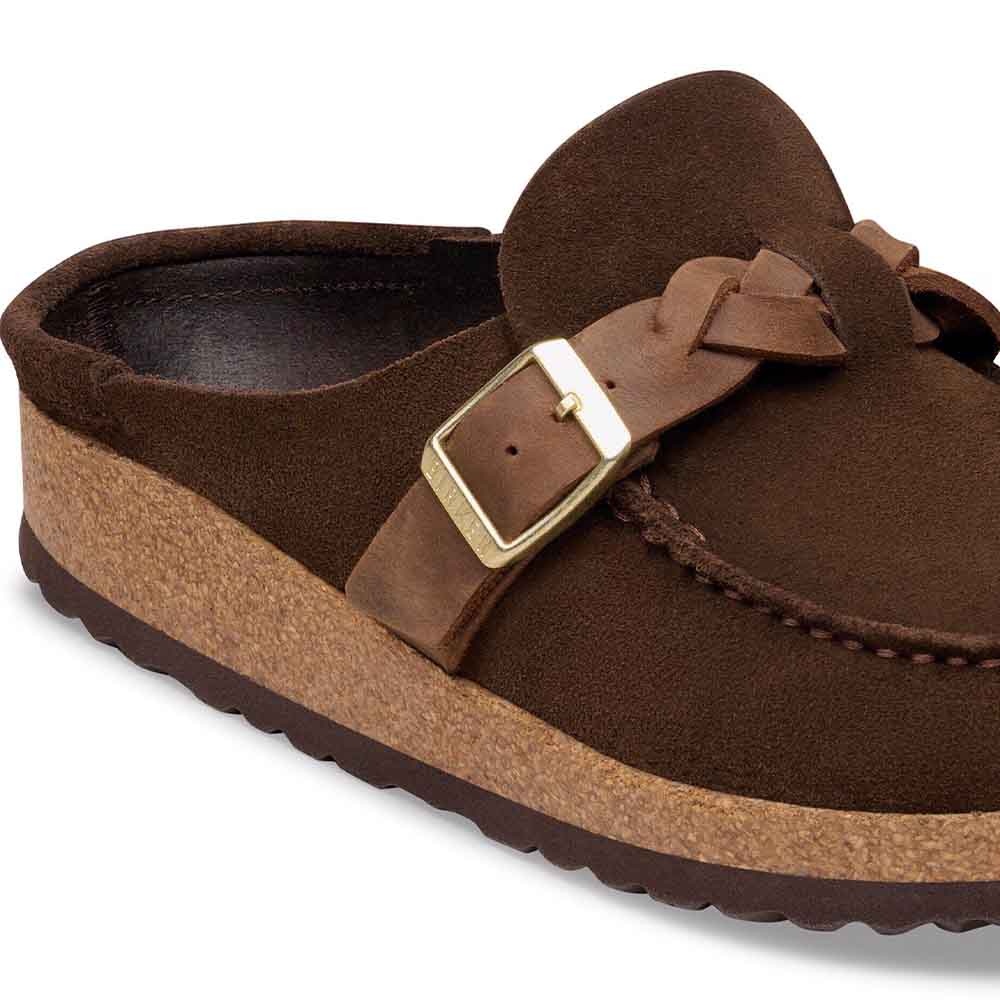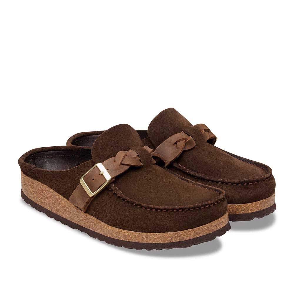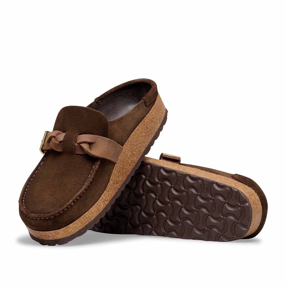 De Birkenstock Buckley Braided bruin suède dames muil combineert moeiteloos comfort met een stijlvolle uitstraling. Dit halfopen model in mocassin-stijl is direct herkenbaar dankzij de brede kurken zool en het iconische design. Het anatomisch gevormde kurk-latex voetbed biedt optimale ondersteuning en zorgt ervoor dat je voeten de hele dag comfortabel blijven.