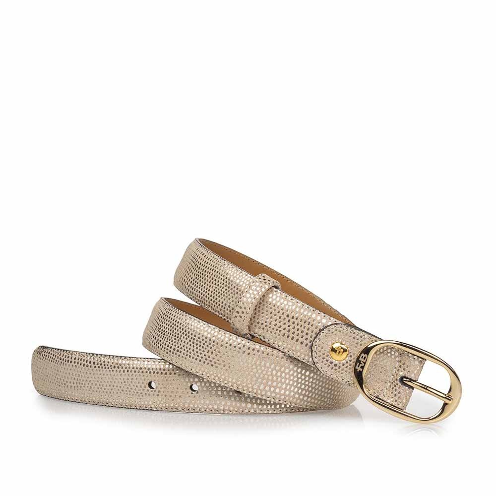 De Belter 41.41 goud damesriem is een stijlvolle en zomerse accessoire die elke outfit laat stralen. De subtiele print over de hele riem geeft een speels en elegant effect, terwijl de gouden kleur zorgt voor een luxe uitstraling. Met een breedte van 3 cm is deze riem perfect te dragen bij jurken, rokken en broeken.