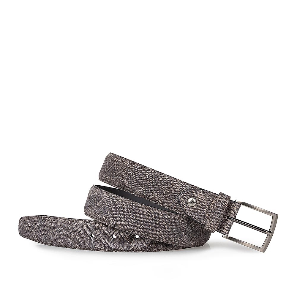 De Floris van Bommel De Belter 52.38 is een stoere herenriem uitgevoerd in zacht taupe suède met een opvallende, unieke print. Deze riem is een absolute eyecatcher en voegt een stijlvolle en robuuste touch toe aan elke outfit. Met een breedte van 3.5 cm past deze riem perfect in elke jeans of pantalon.