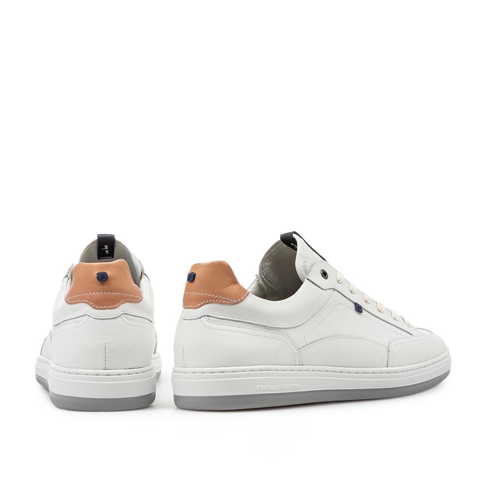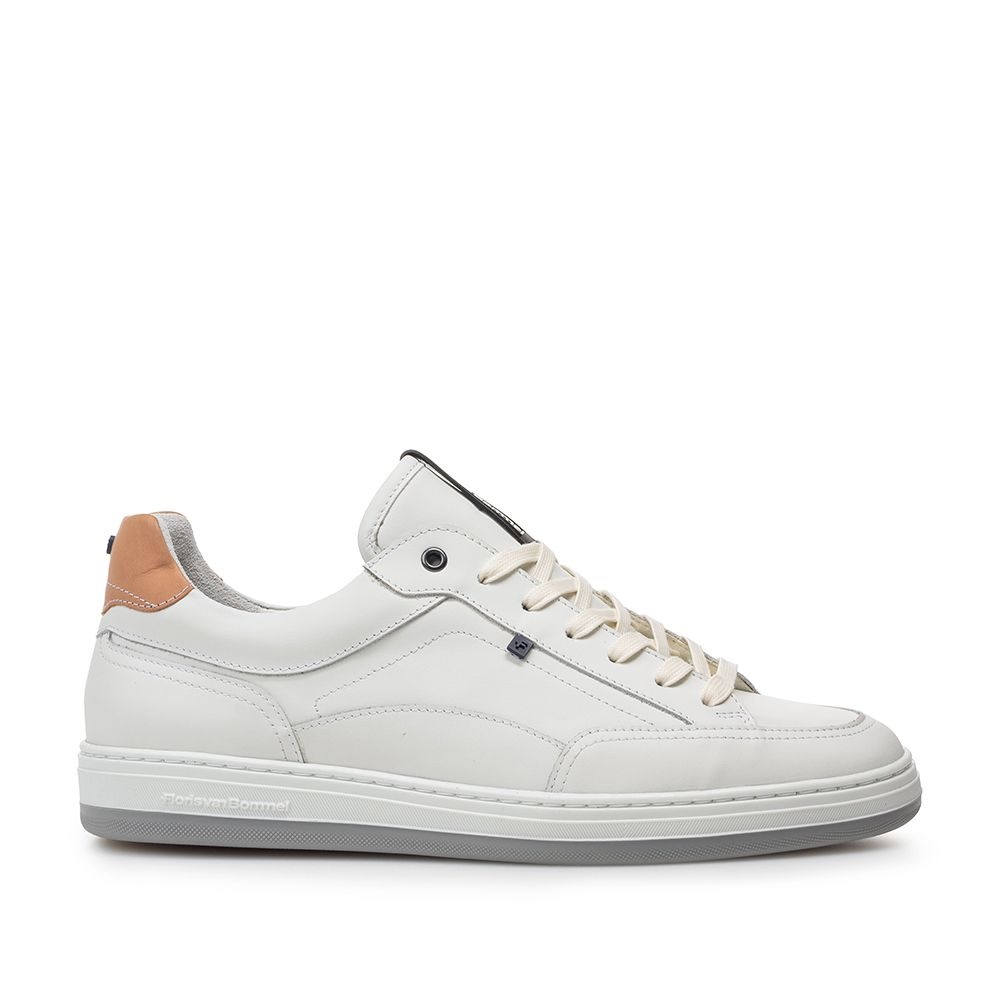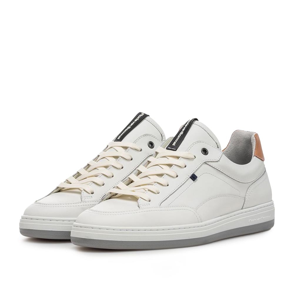 De Floris van Bommel De Dijker 01.18 Wit is een moderne heren sneaker die perfect aansluit bij een verzorgde zomerse look. Het hoogwaardige witte leer geeft de schoen een frisse en luxe uitstraling, waardoor hij moeiteloos te combineren is met zowel casual als nette outfits. De rechte witte zool zorgt voor een eigentijdse uitstraling en extra stabiliteit tijdens het lopen.