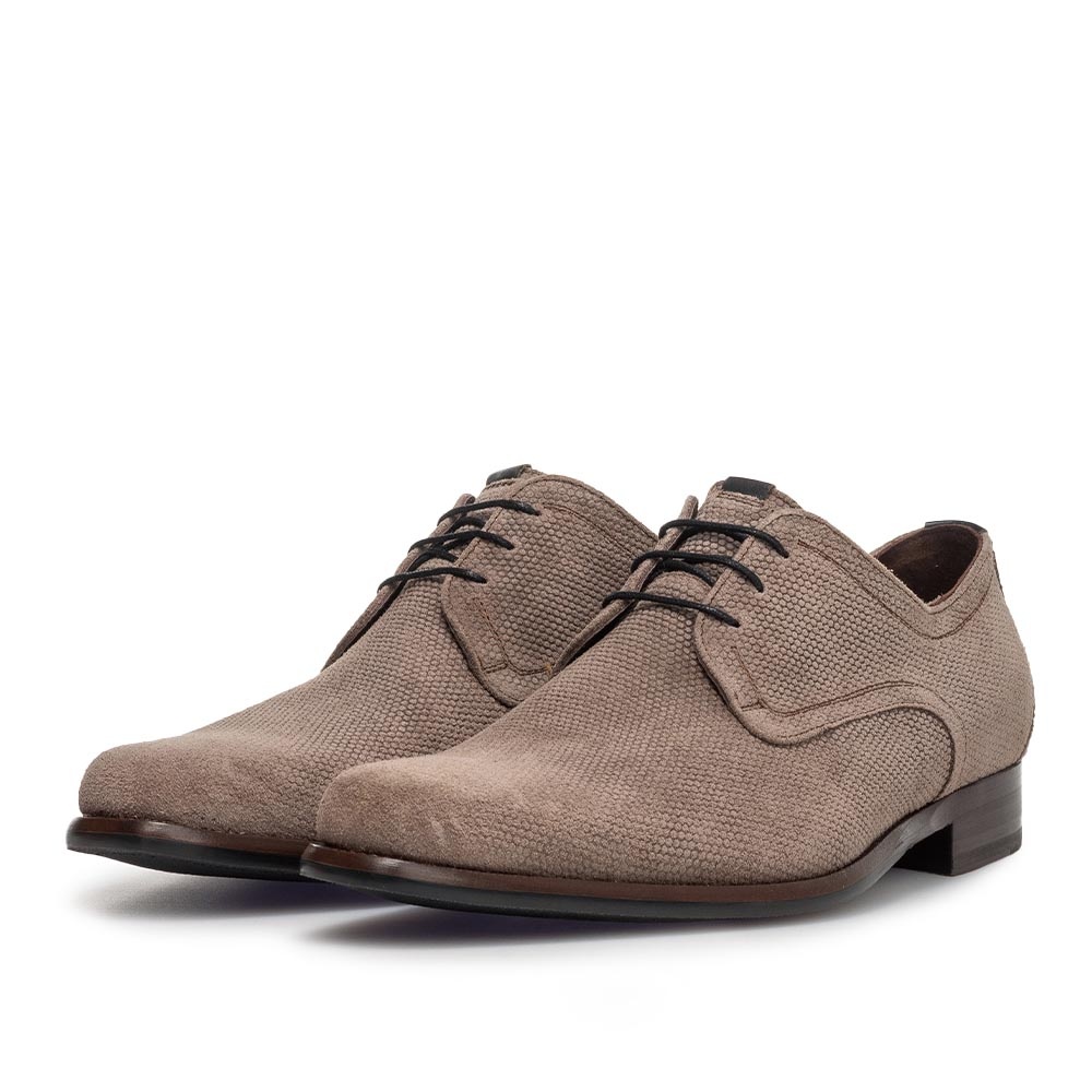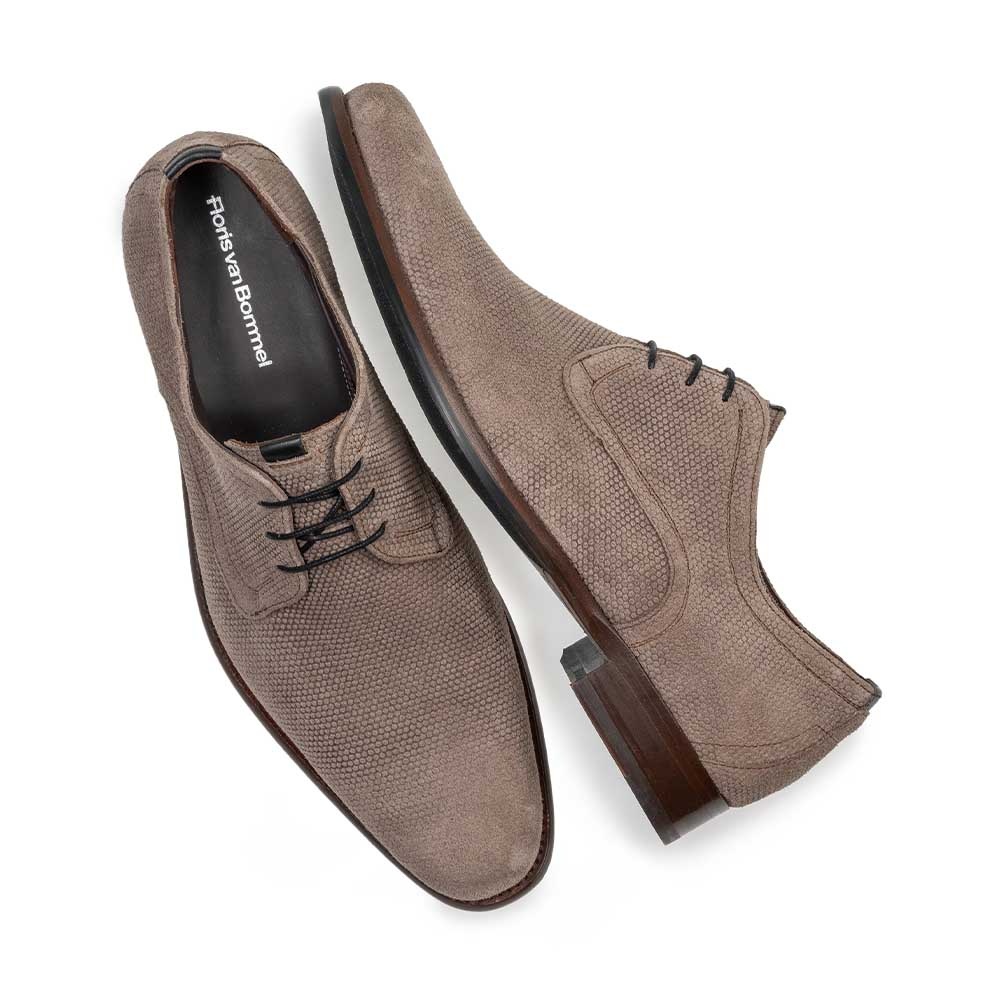 Als onderdeel van de bekende Floris van Bommel collectie is dit model ontworpen met oog voor detail en vakmanschap. Het taupe kleurige suede voelt zacht aan, oogt chic en is eenvoudig te combineren met diverse outfits. Draag deze veterschoen onder een net pak of een nette jeans voor een verzorgde look.