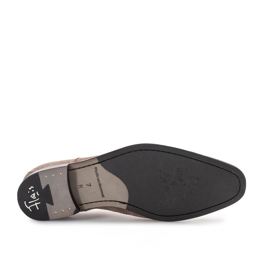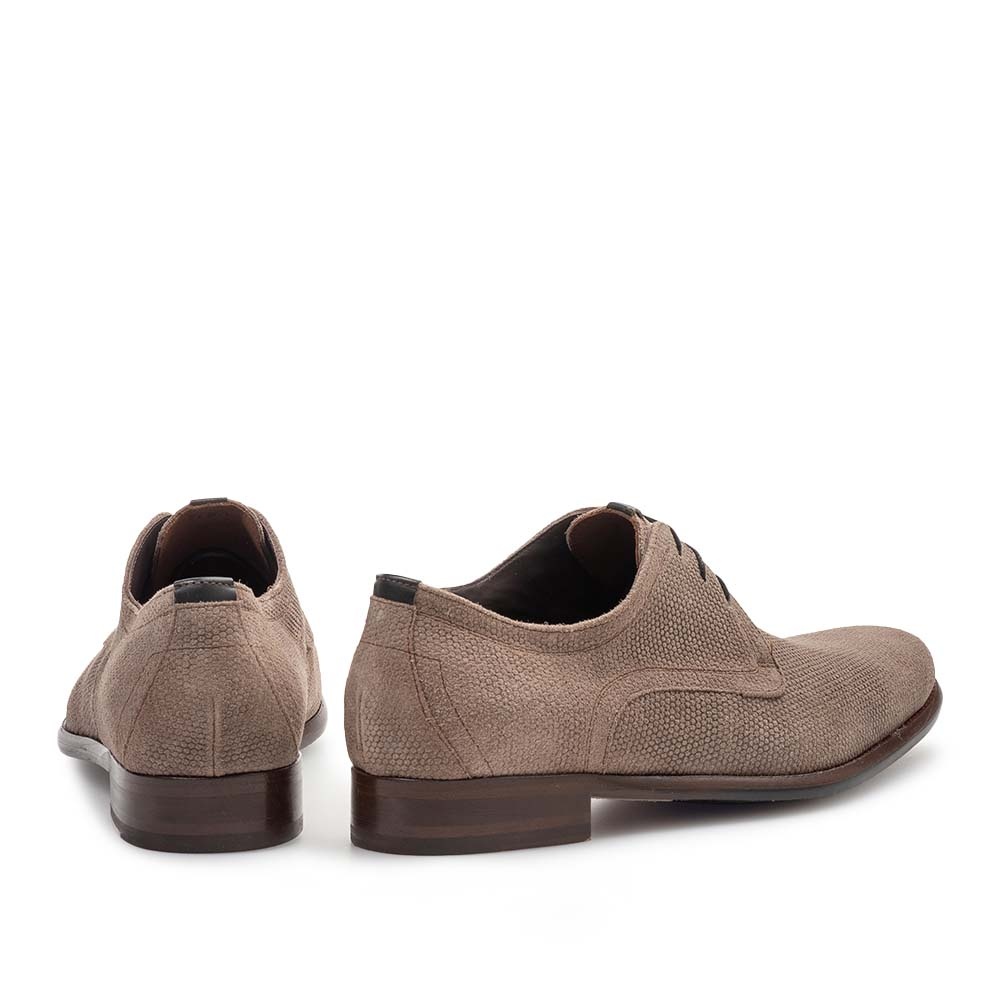 De Floris van Bommel De Draver 03.22 is een stijlvolle taupe suede veterschoen voor heren die elegantie combineert met comfort. Dankzij de subtiele print over het suede krijgt de schoen een moderne twist, terwijl de klassieke vetersluiting zorgt voor een tijdloze uitstraling.