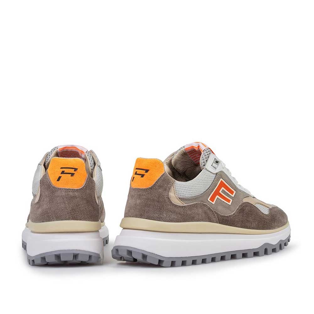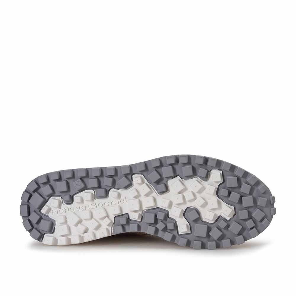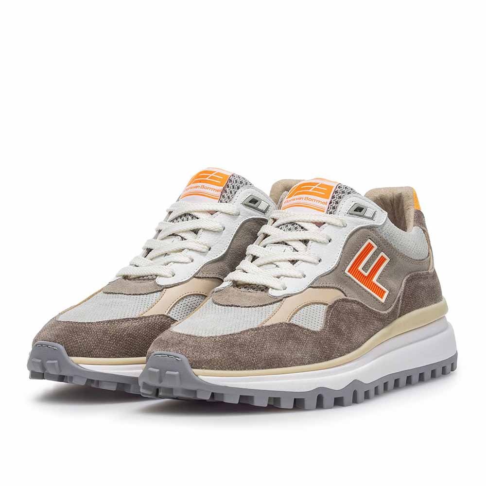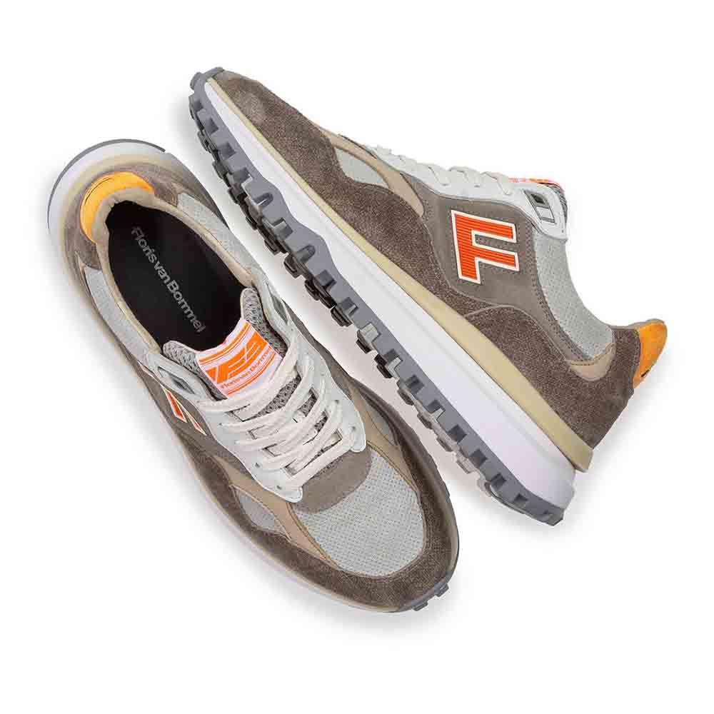 De Floris van Bommel De Gripper 01.27 Taupe is een opvallende heren sneaker met een krachtige, moderne uitstraling. Het bovenwerk bestaat uit een hoogwaardige mix van suede, leer en ademend mesh, wat zorgt voor een dynamisch en sportief design. De taupe kleurstelling wordt versterkt door de iconische oranje details, waaronder het herkenbare F-design aan de zijkant, typisch Floris van Bommel.