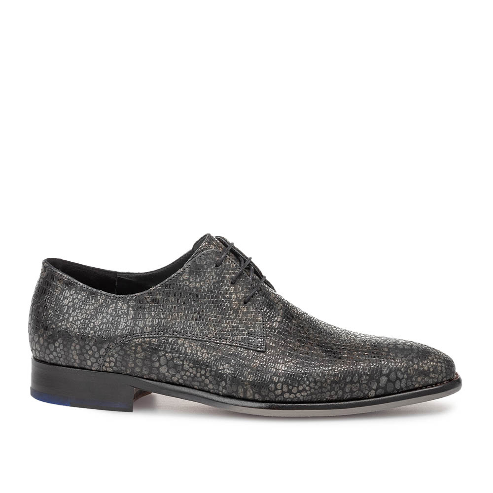 Het patroon over het hele oppervlak van de schoen zorgt voor een unieke en moderne uitstraling, terwijl het hoogwaardige leer een luxe finish geeft. De fijne vetersluiting en het subtiele Floris van Bommel details maken deze schoen tot een absolute must-have voor heren met oog voor detail.
