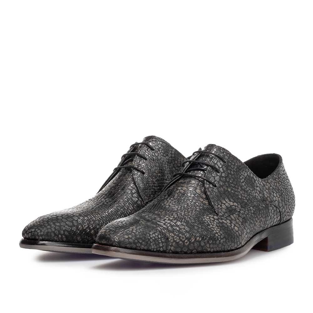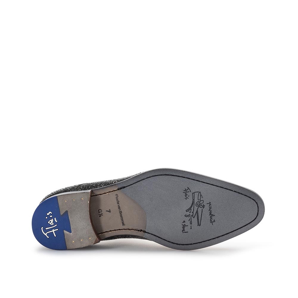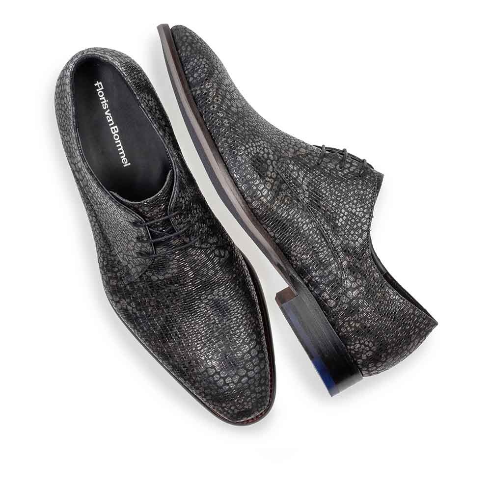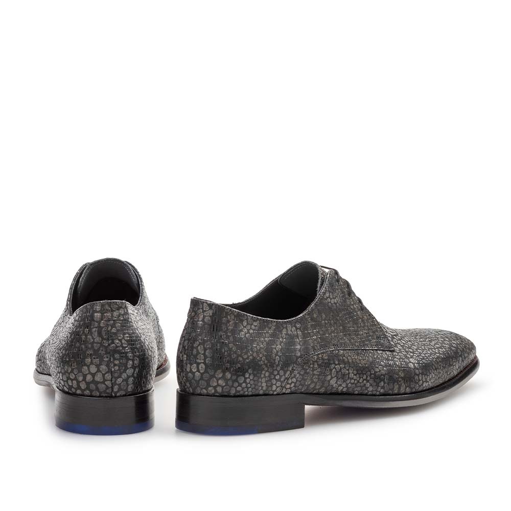 Het patroon over het hele oppervlak van de schoen zorgt voor een unieke en moderne uitstraling, terwijl het hoogwaardige leer een luxe finish geeft. De fijne vetersluiting en het subtiele Floris van Bommel details maken deze schoen tot een absolute must-have voor heren met oog voor detail.