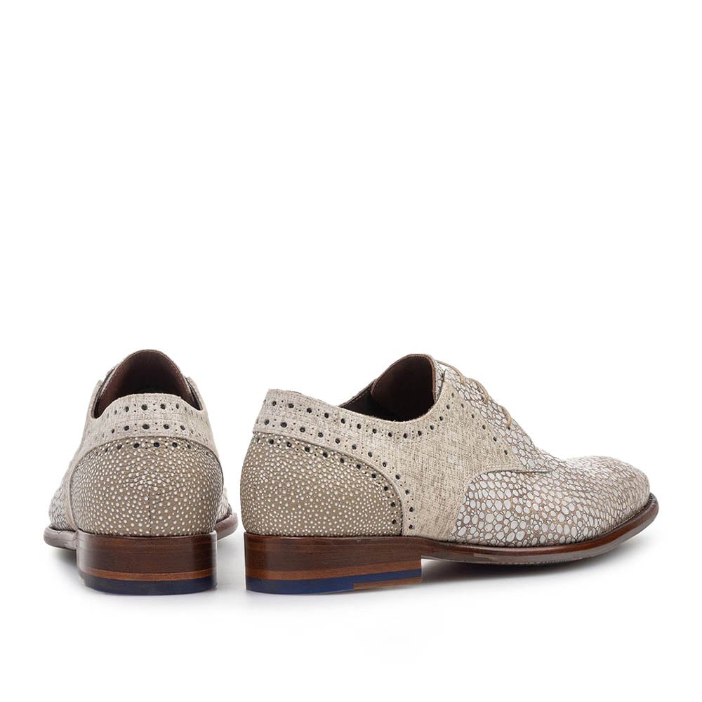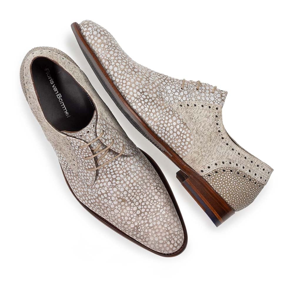 De Floris van Bommel De Stapper 39.65 beige is een geklede heren veterschoen die stijl en karakter perfect combineert. Dankzij de elegante leest oogt de schoen verfijnd, terwijl de unieke print over de gehele schoen zorgt voor een opvallende en moderne uitstraling. Ideaal voor heren die hun chique outfit een vrolijke zomerse twist willen geven.