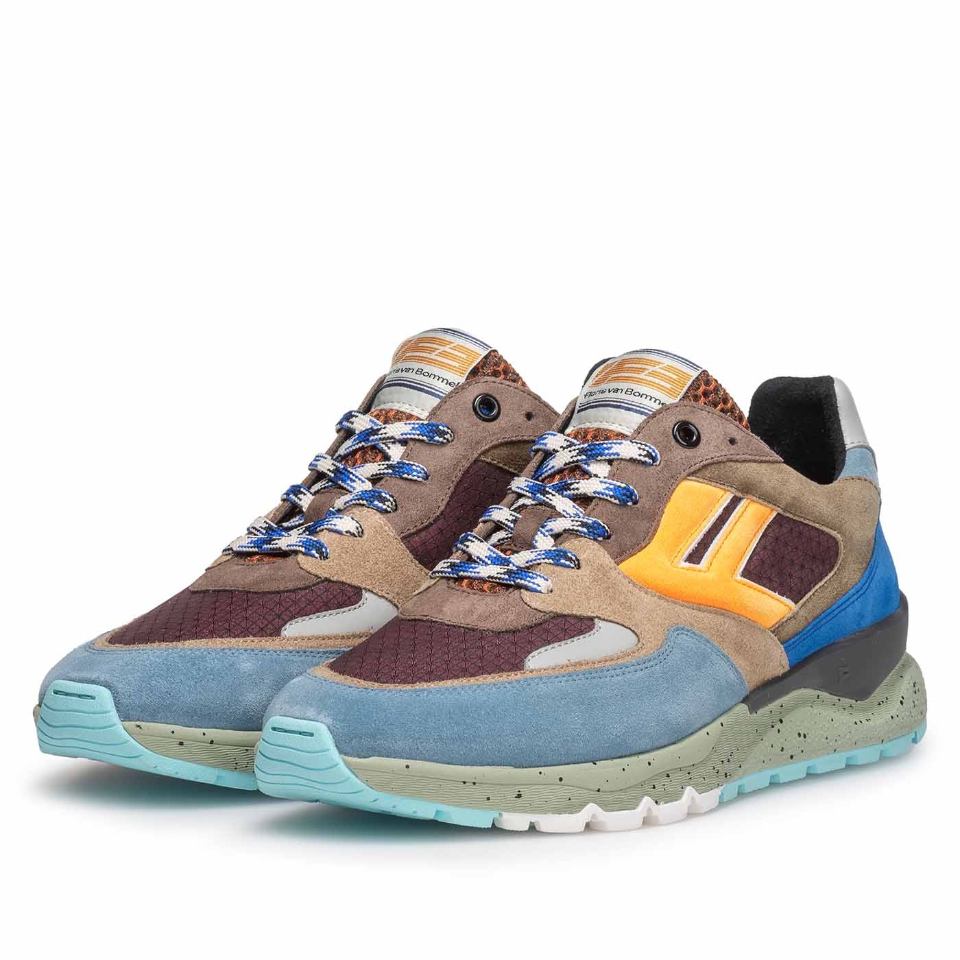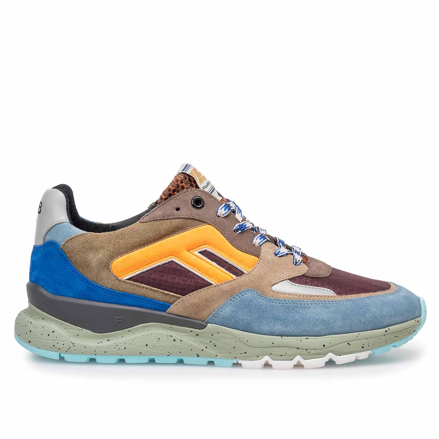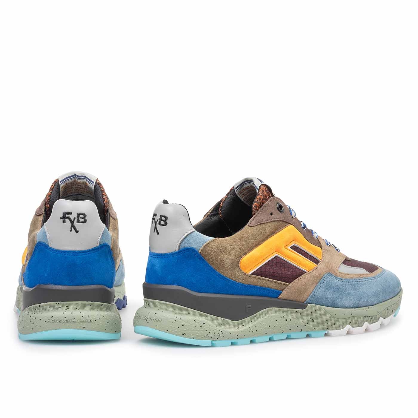 Deze Floris van Bommel heren sneaker is een echte blikvanger dankzij de opvallende kleurencombinatie van oranje, lichtblauw, bruin en een unieke mintkleurige zool. De combinatie van deze tinten geeft de sneaker een frisse, stoere en sportieve uitstraling die perfect past bij de modieuze man met lef.