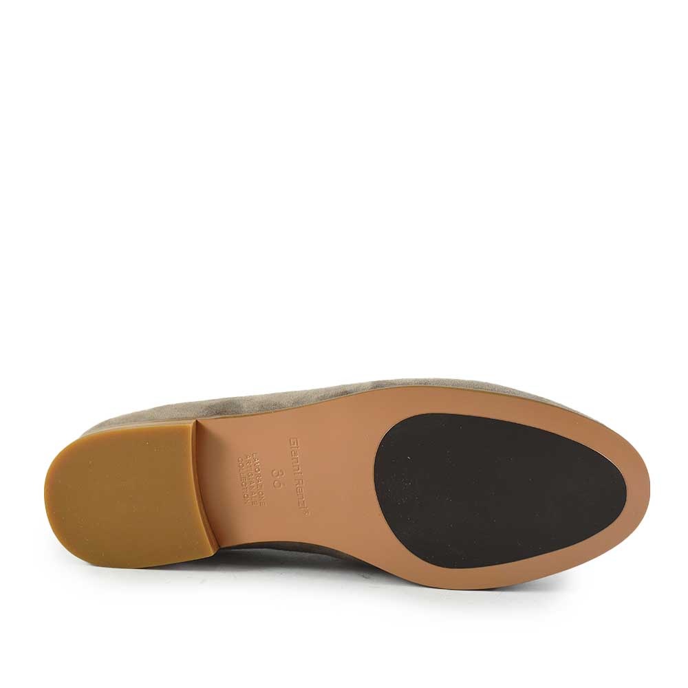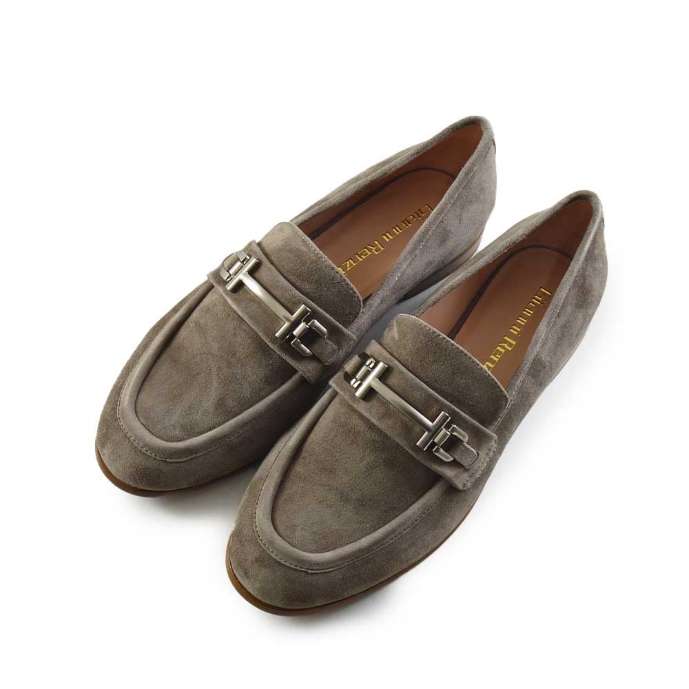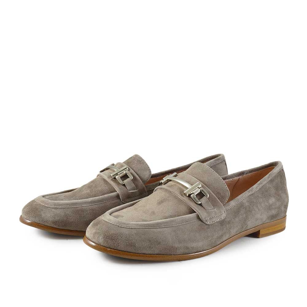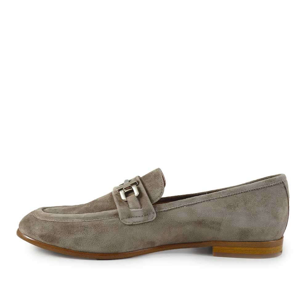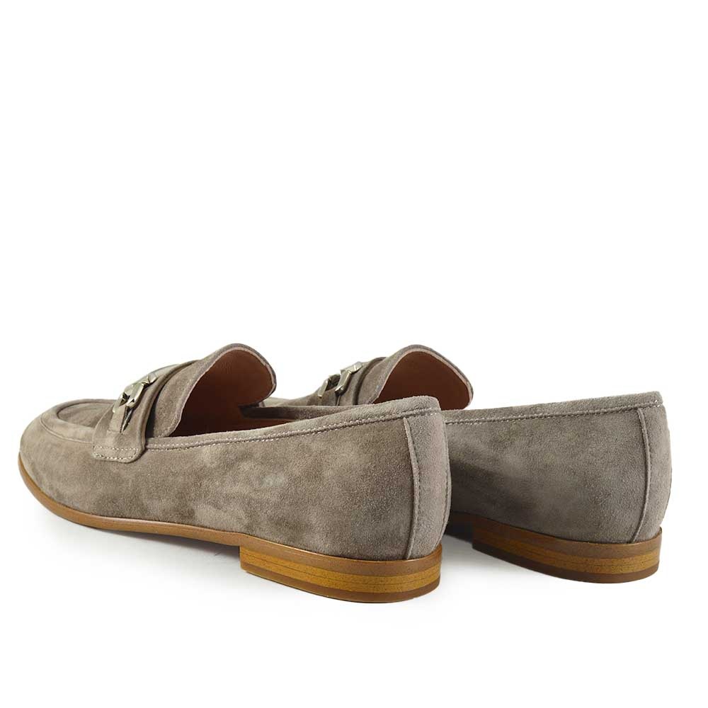 Gianni Renzi Esmee taupe suede dames loafer met zilver bitje en flexibele zool. Elegante en comfortabele zomerschoen met zacht leren voetbed.