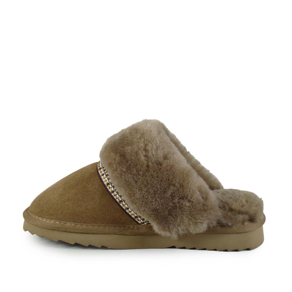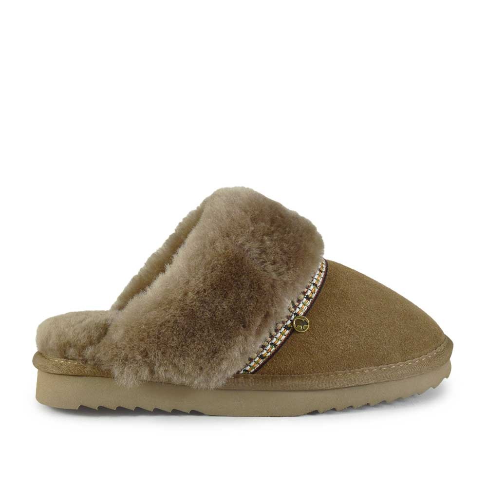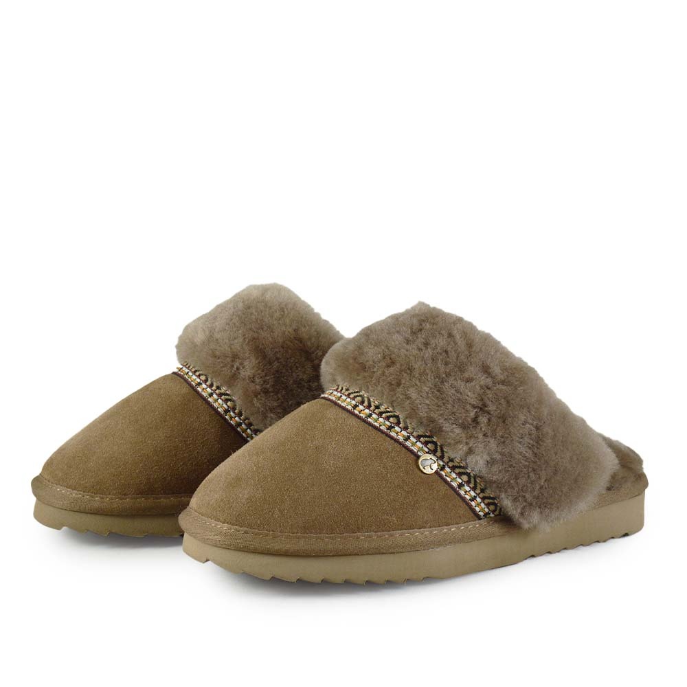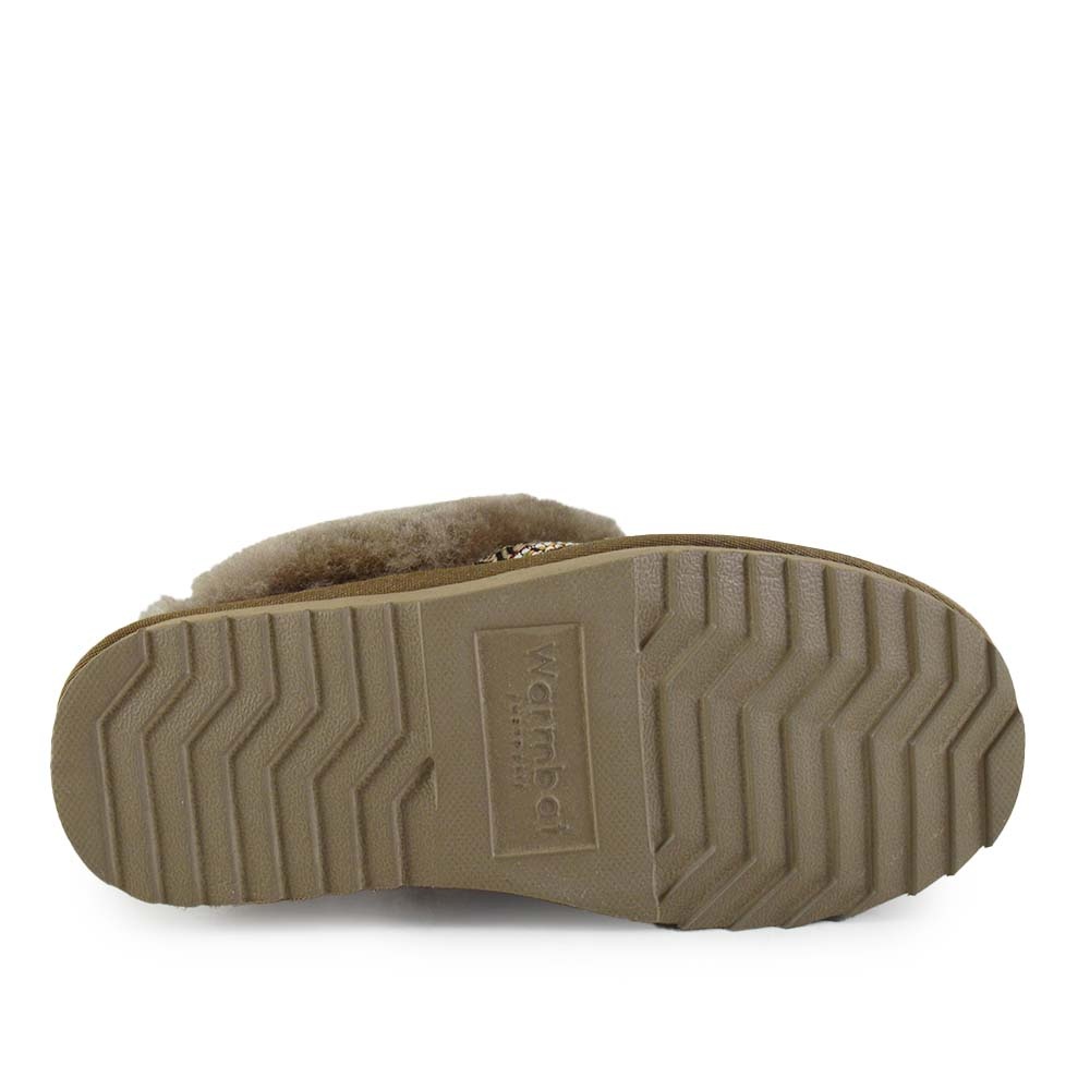 Geniet van stijl en comfort in één met de Warmbat Flurry Tape Mud Taupe dames pantoffel, de perfecte keuze voor warme en chique voeten in de winter!