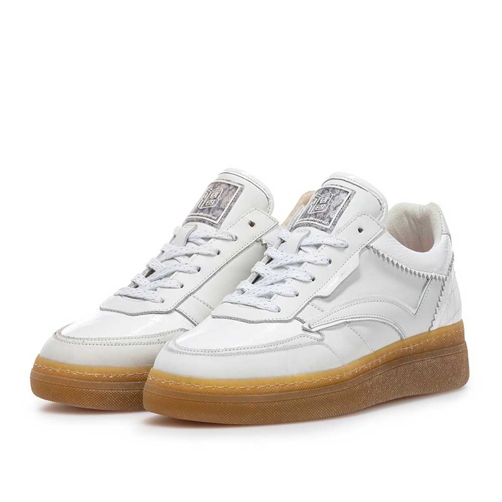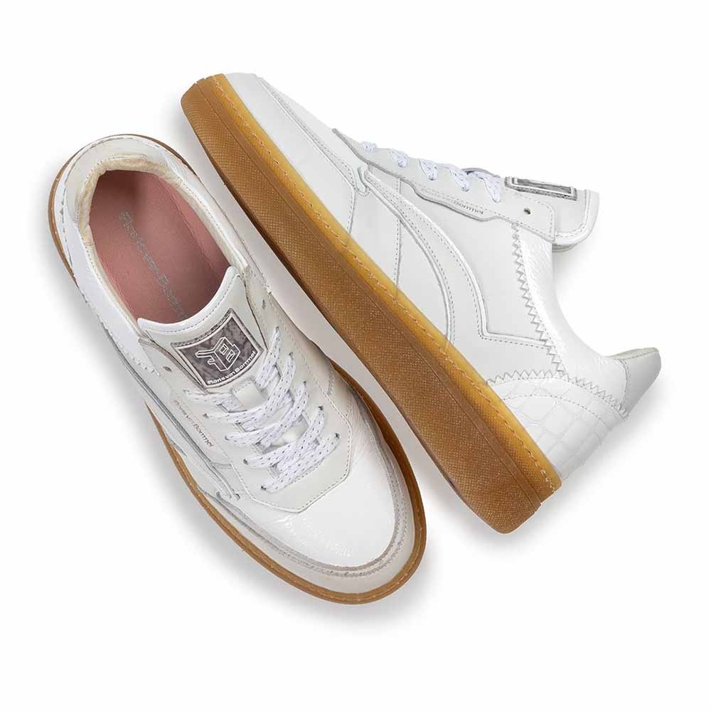 Deze Floris van Bommel sneaker is vervaardigd van hoogwaardig leer en verfijnd met lakleren details voor een luxe uitstraling. De witte veters zorgen voor een clean geheel, terwijl de iets dikkere bruine zool een trendy contrast geeft. Dankzij de zorgvuldige afwerking en het tijdloze ontwerp is dit een sneaker waar je jarenlang plezier van hebt.