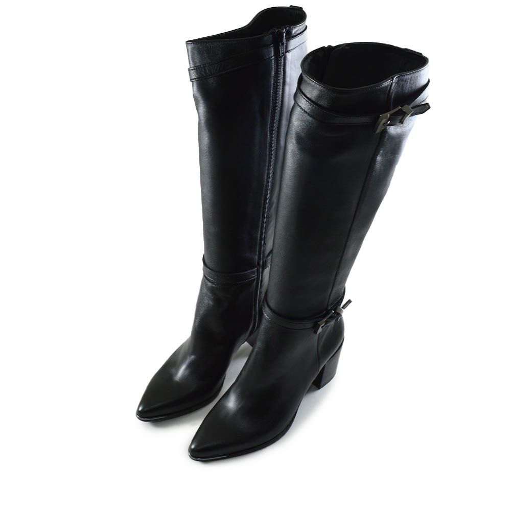 De Trento Golden Buckle is een verfijnde zwarte leren dameslaars die klasse en stijl uitstraalt. De elegante spitse leest en het zilveren detail op de neus geven deze laars een unieke, moderne uitstraling. De twee gespen aan de schacht zorgen voor een stoer accent, terwijl de hoge rits een perfecte pasvorm en gemak bij het aantrekken biedt.