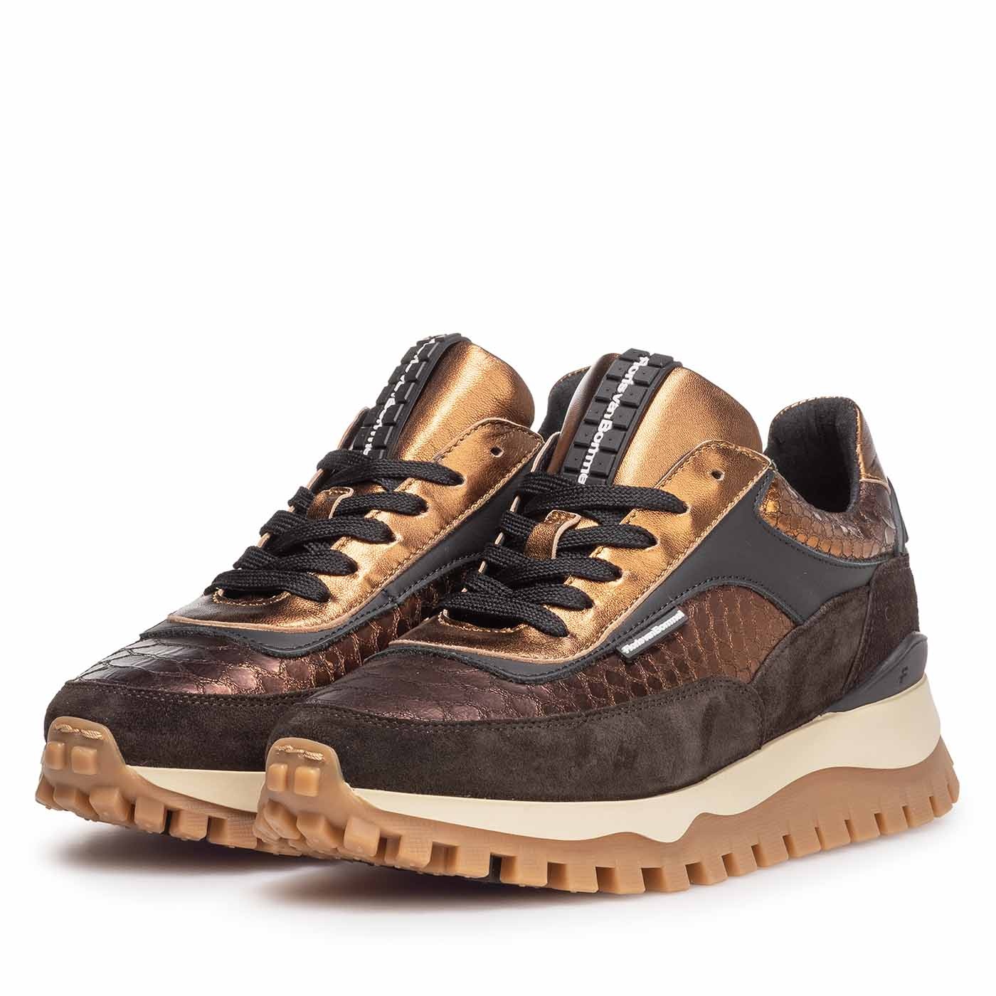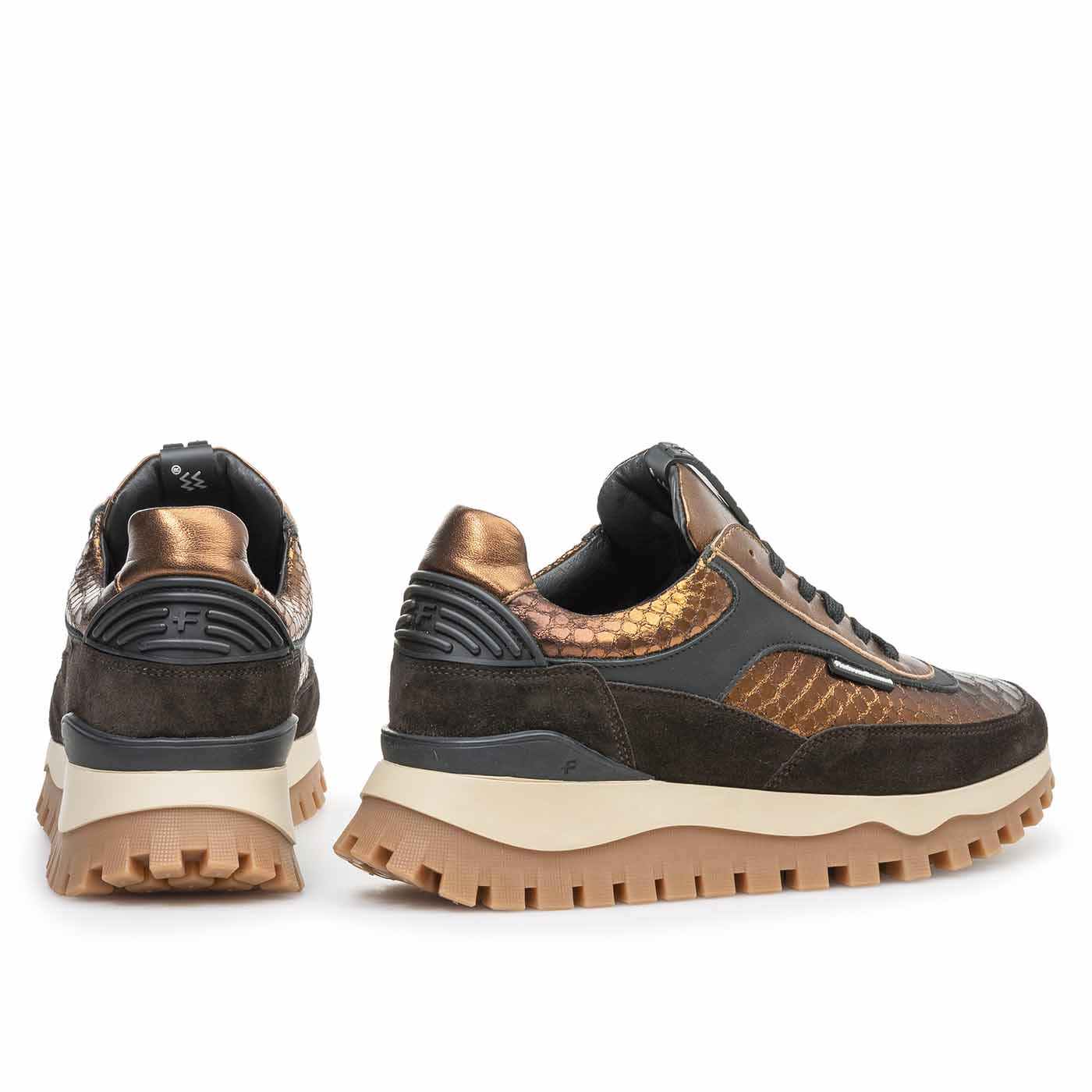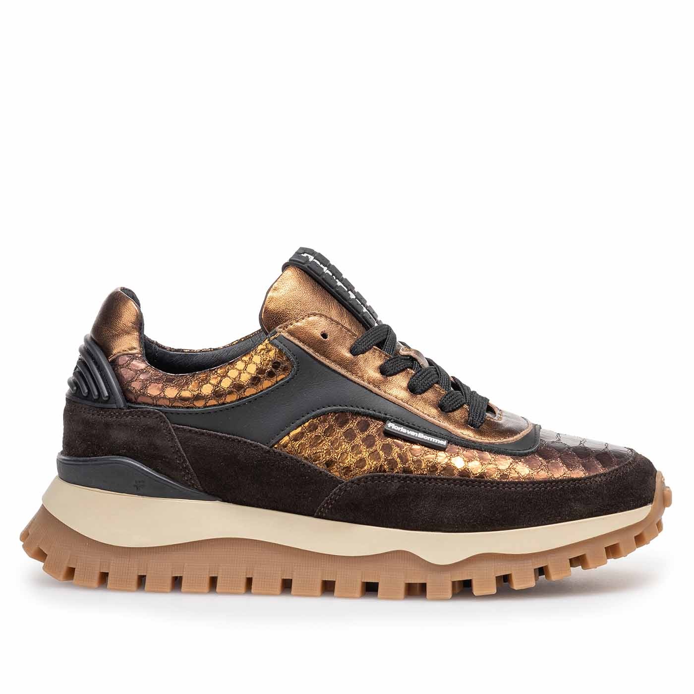 De Floris van Bommel Grommi 01.17 is een opvallende dames sneaker die luxe en stoerheid perfect combineert. De combinatie van bruin leer met een unieke brons metallic croco print maakt deze sneaker een stijlvolle eyecatcher. Door het metallic effect krijgt de sneaker een exclusieve uitstraling die bij elke outfit past.