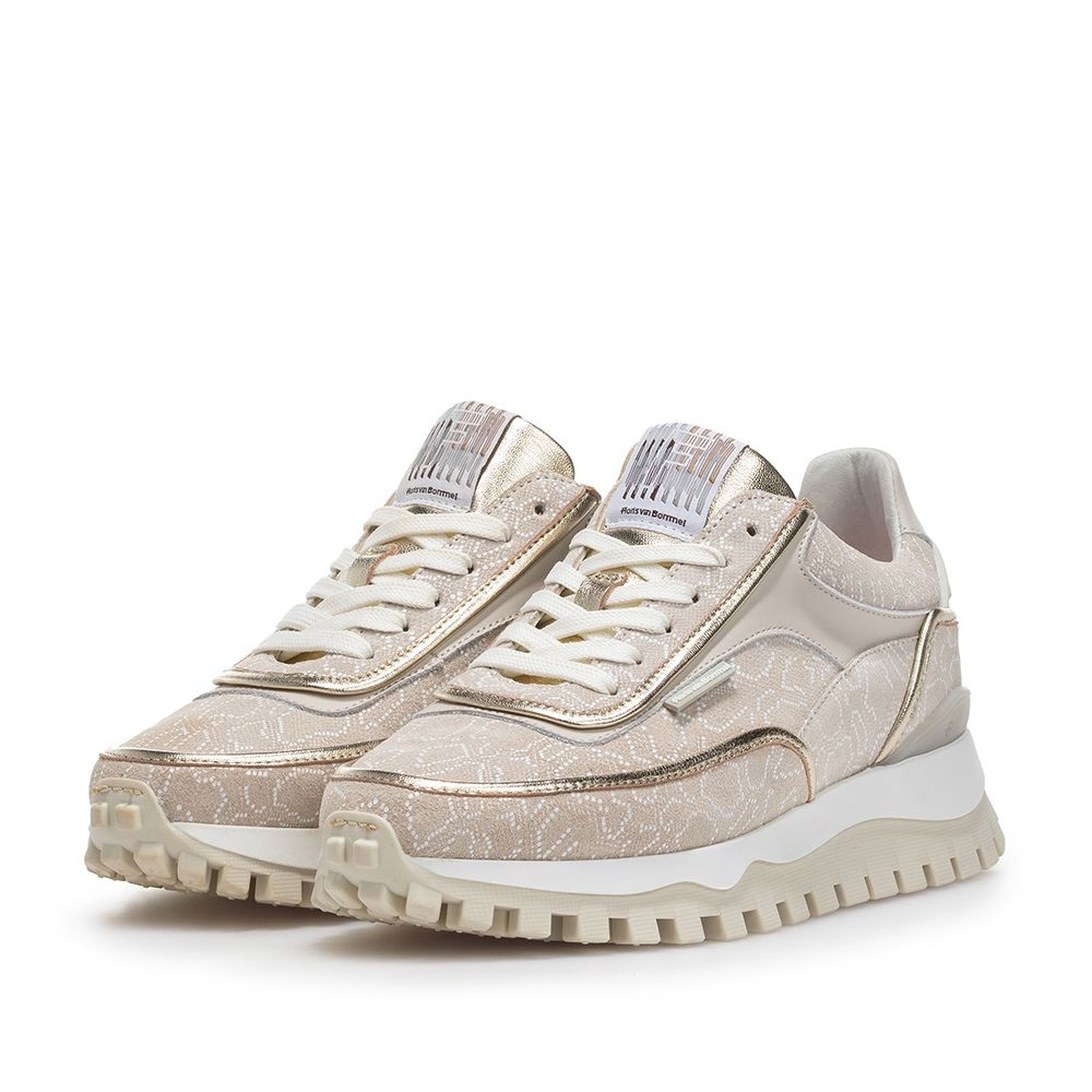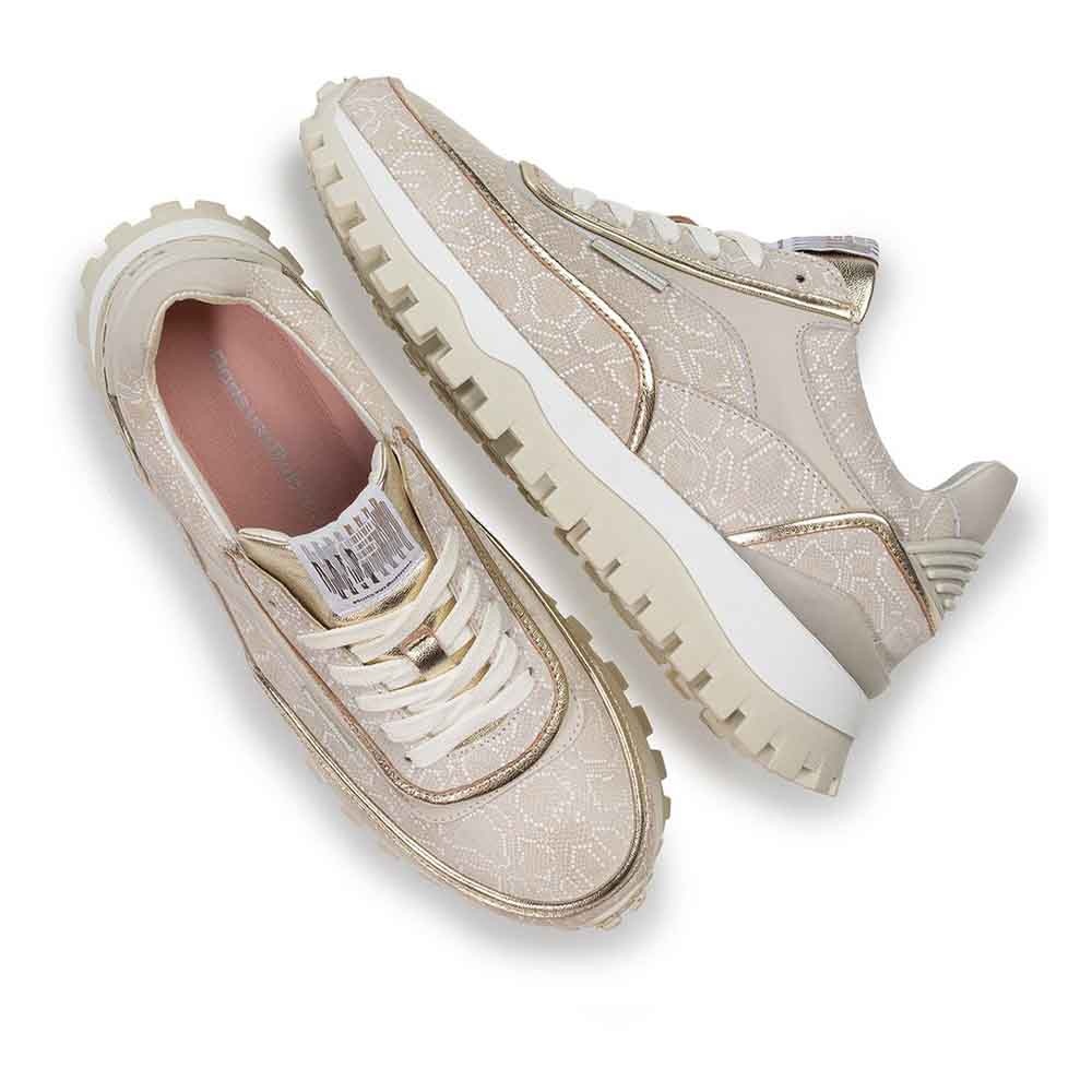 Dames sneaker Floris van Bommel Grommi Taupe met stoere zool, unieke print en gouden details. Comfortabel met uitneembaar voetbed, ideaal voor elk seizoen.