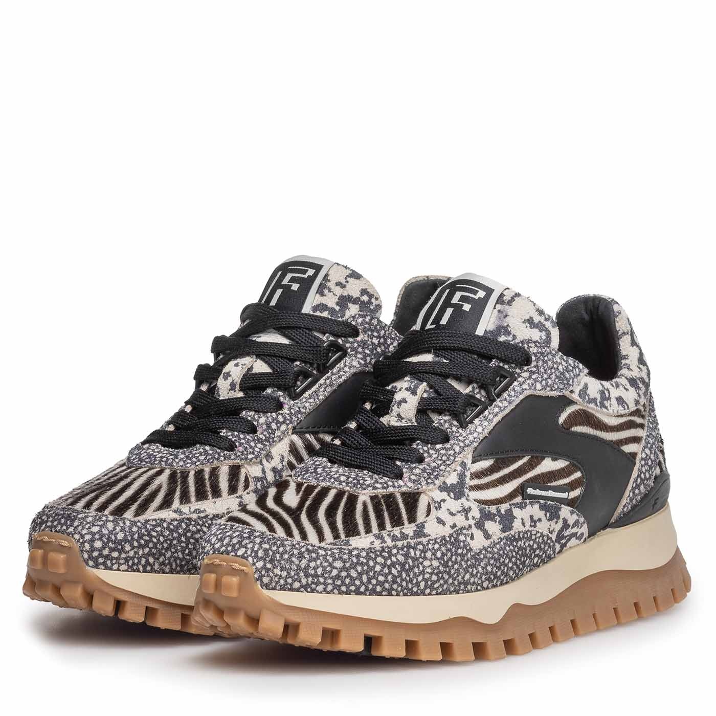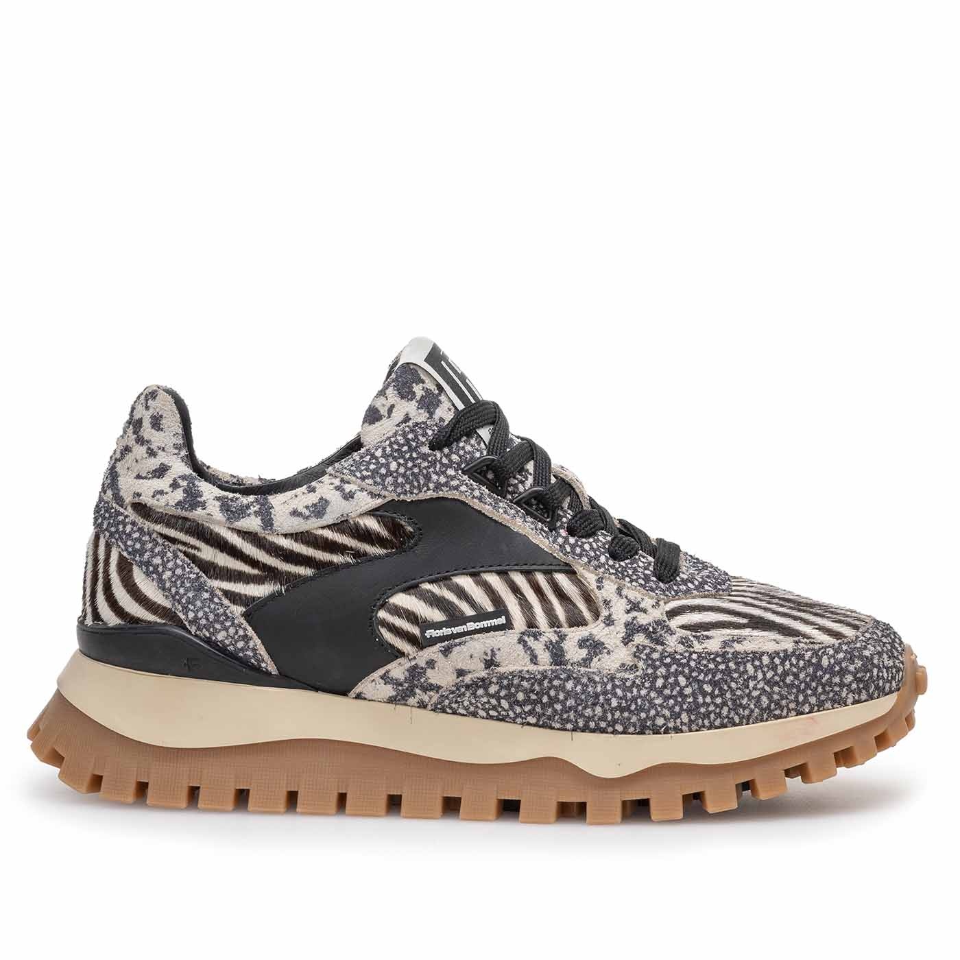 De Floris van Bommel Grommi 04.01 Combi Zwart print is een zeer unieke dames sneaker gemaakt van hoogwaardig pony leer met een opvallende zebra print. De combinatie van zwart en wit geeft de sneaker een stoere en moderne uitstraling, perfect voor vrouwen die durven op te vallen.