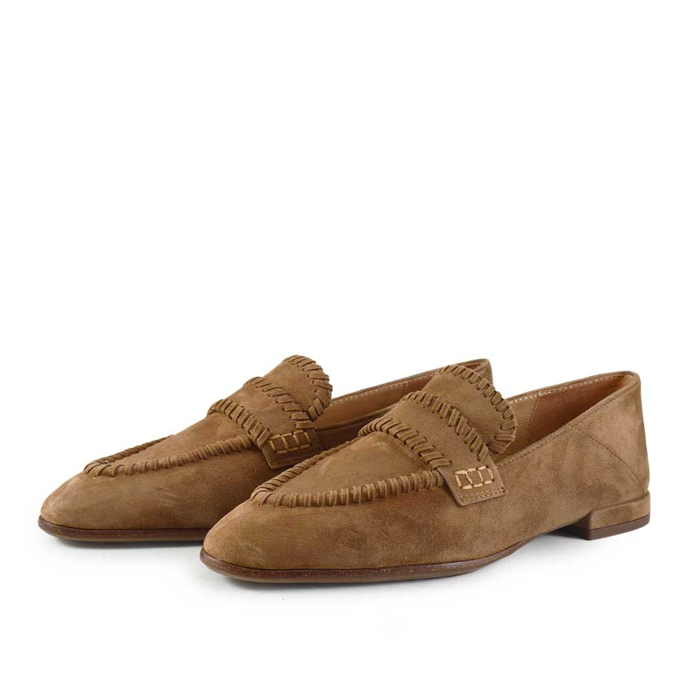 Gianni Renzi Isa cognac suede dames loafer met spitse leest en flexibele zool. Elegante en comfortabele zomerschoen met zacht leren voetbed.