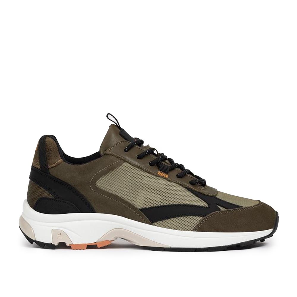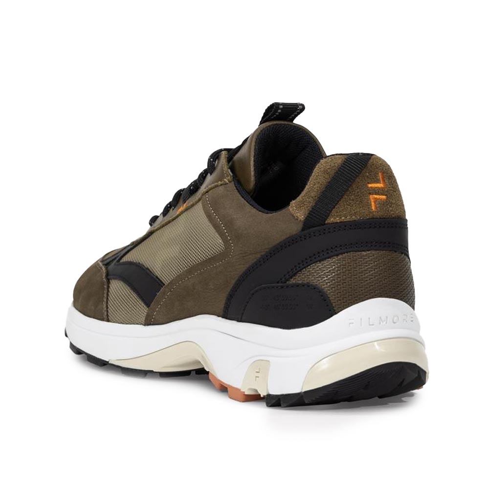 De Krafla Mud Groen heren sneaker van Filmore is een perfecte mix van sportief design en luxe materialen. Deze trail runner geïnspireerde schoen combineert een donkergroene basis van LWG-gecertificeerd leer, nubuck en gewaxt suède met zwarte rubberdetails en een reflecterend mesh-logo. Het asymmetrische ontwerp en de cleane afwerking maken dit tot een echte Filmore klassieker.