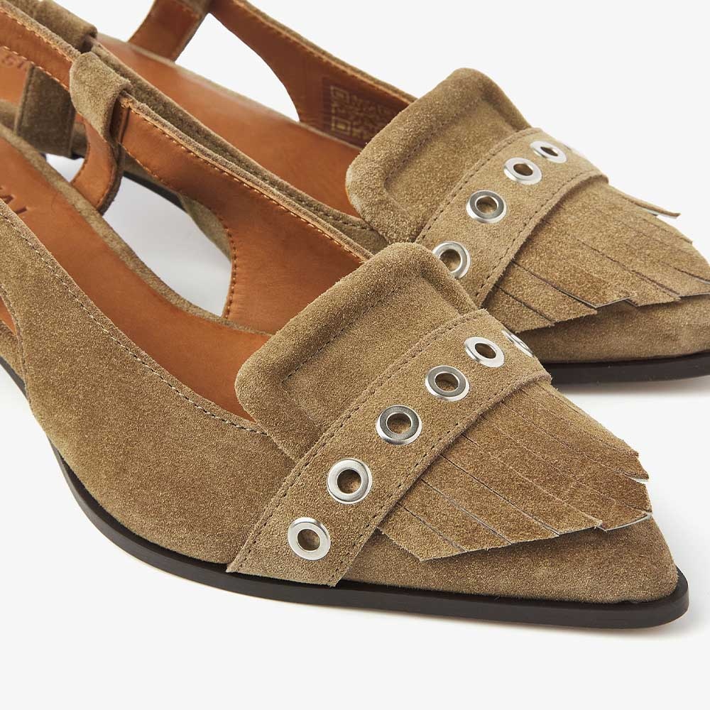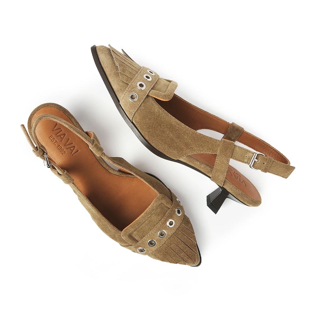 De Via Vai Lea Katie Cognac is een elegante dames slingback die moeiteloos stijl en comfort combineert. Met een spitse leest en een slanke, 3.5 cm hoge hak geeft deze schoen een verfijnde uitstraling, perfect voor zowel kantoor als een avondje uit. Het prachtige suede leer zorgt voor een luxe uitstraling en een zachte touch.