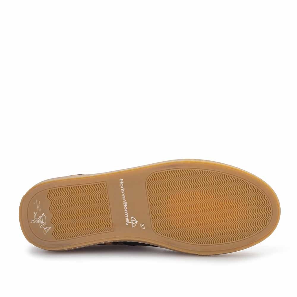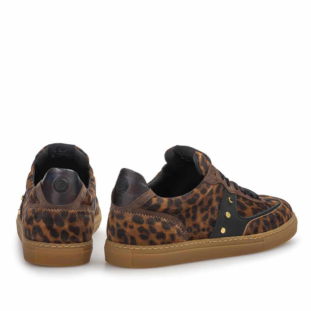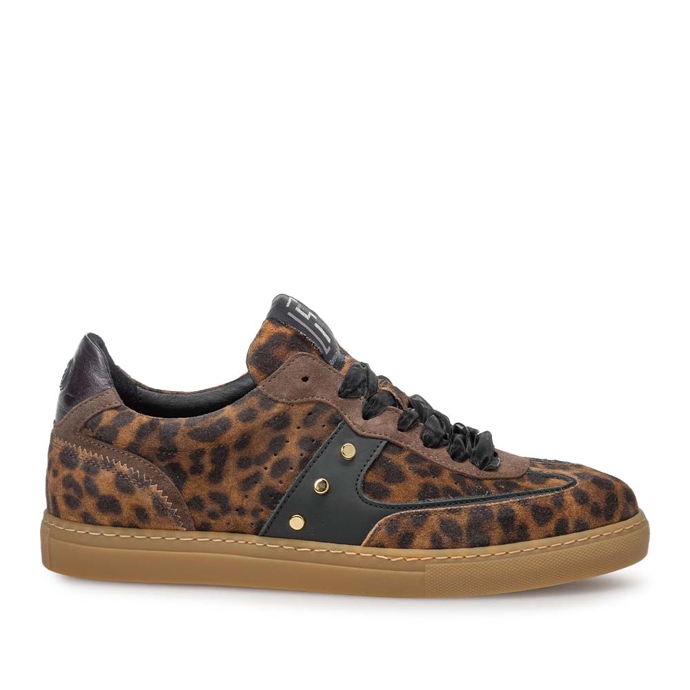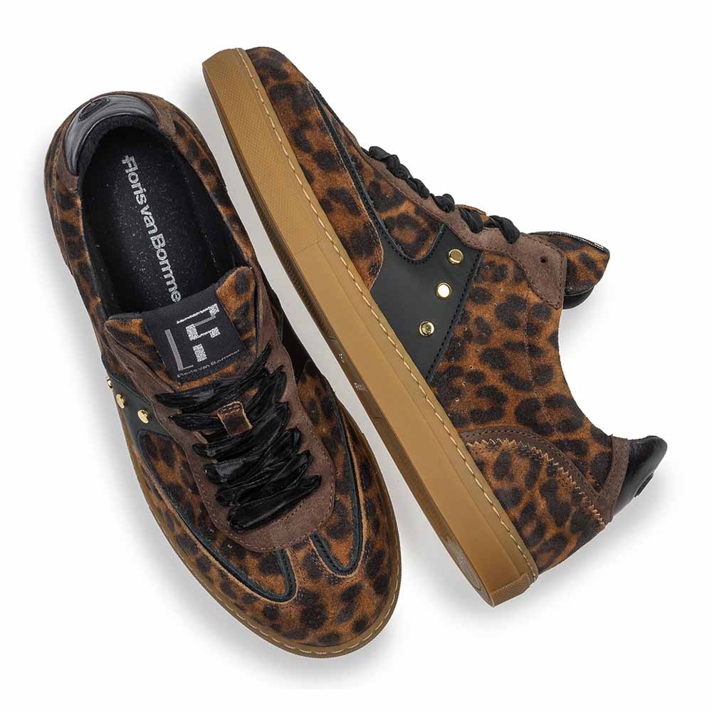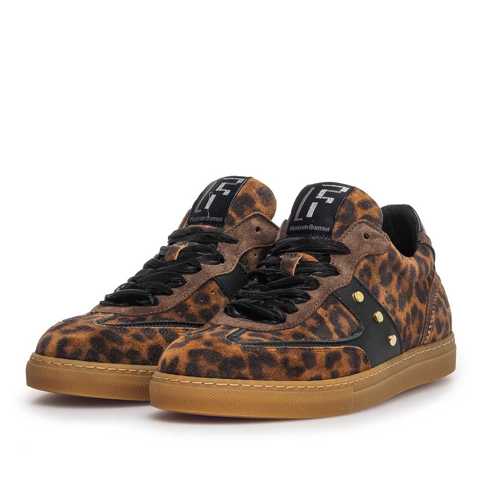 Unieke Floris van Bommel Minni Leo sneaker dames met panterprint, zwarte veters, rechte bruine zool en uitneembaar voetbed. Perfect voor winter!
