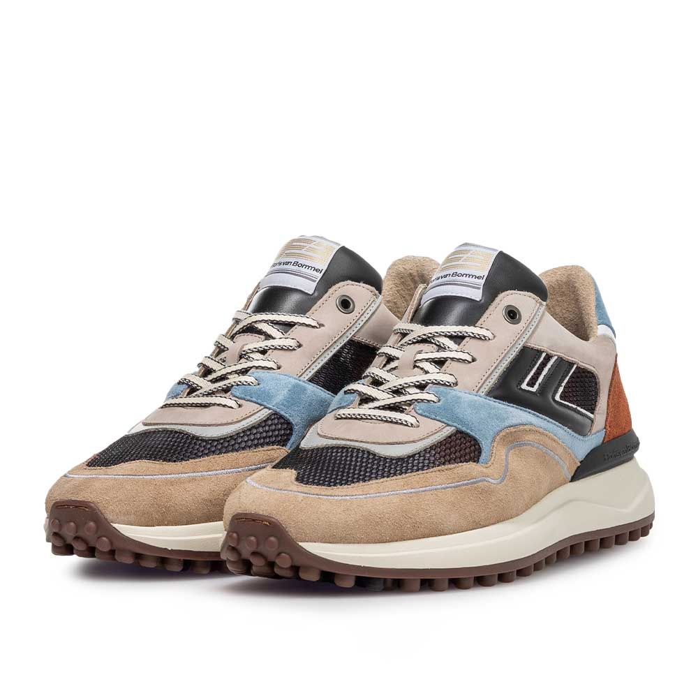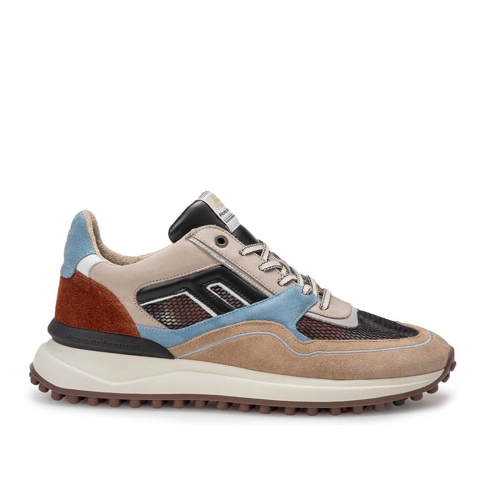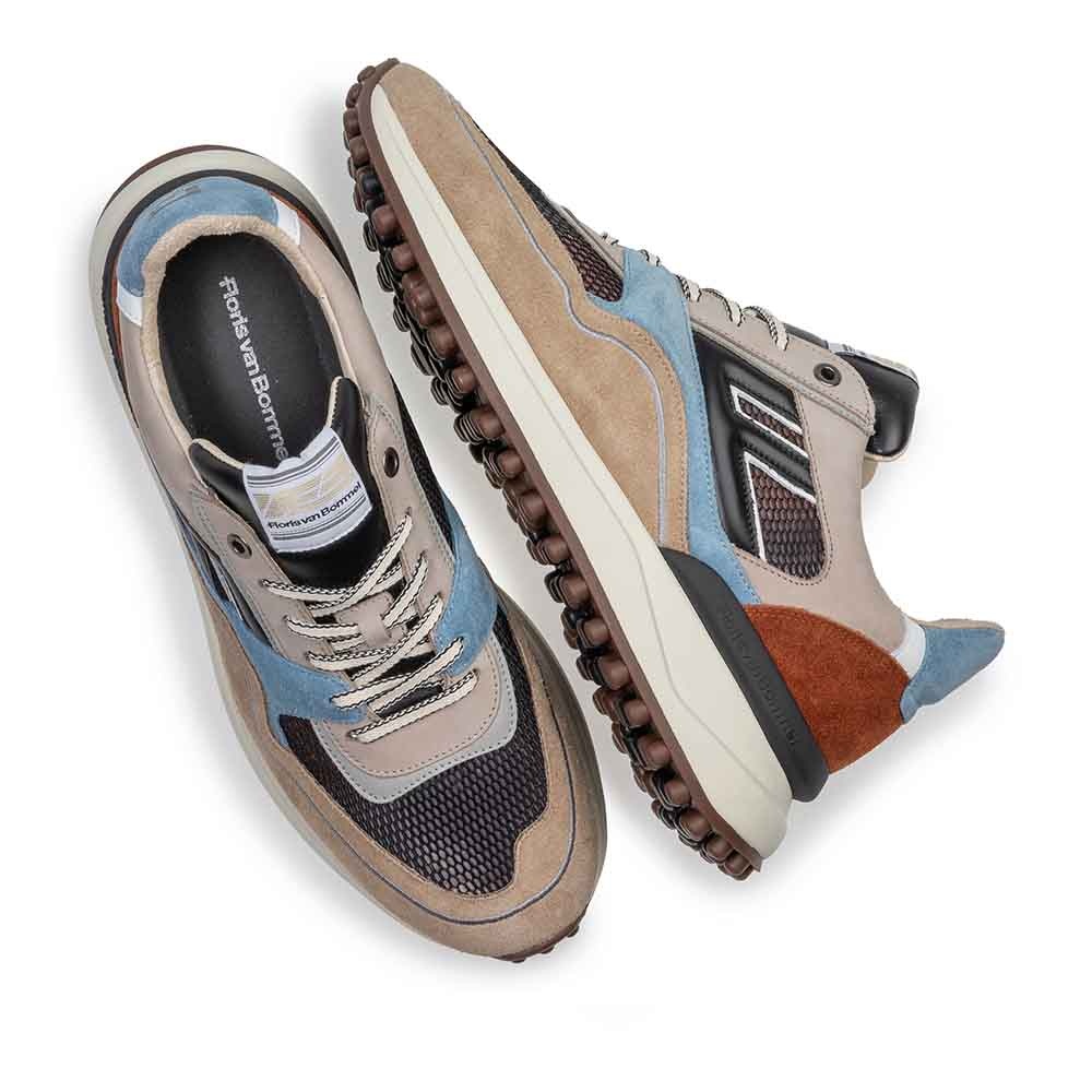 De Floris van Bommel Noppi 29.51 heren sneaker is een stijlvolle keuze voor mannen die oog hebben voor detail. De sneaker is uitgevoerd in hoogwaardig beige suede en combineert dit met lichtblauwe accenten en een opvallende bordo hak. Het grote zwarte F-design op de zijkant maakt deze sneaker direct herkenbaar en geeft een moderne, luxe uitstraling.