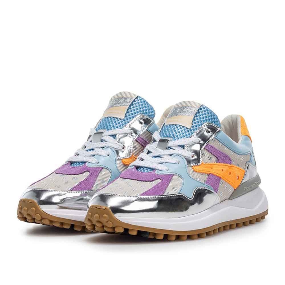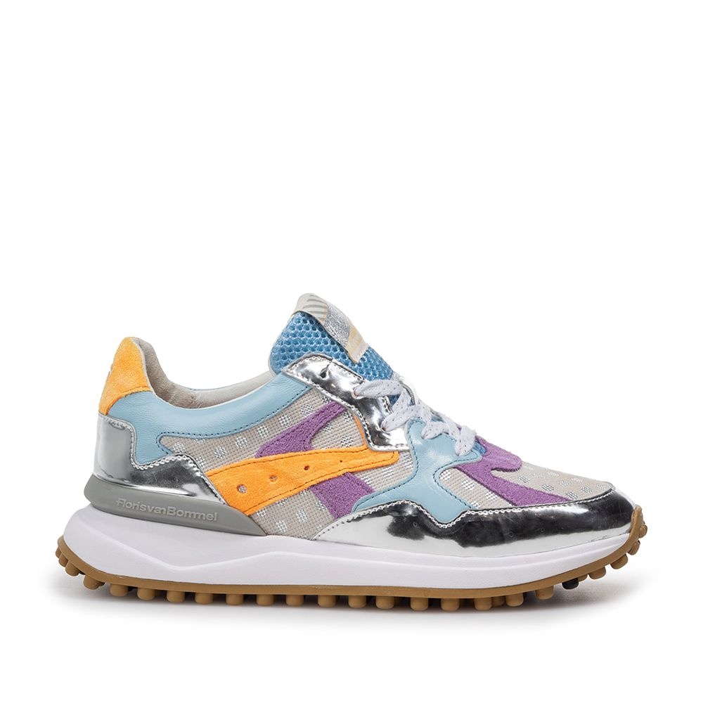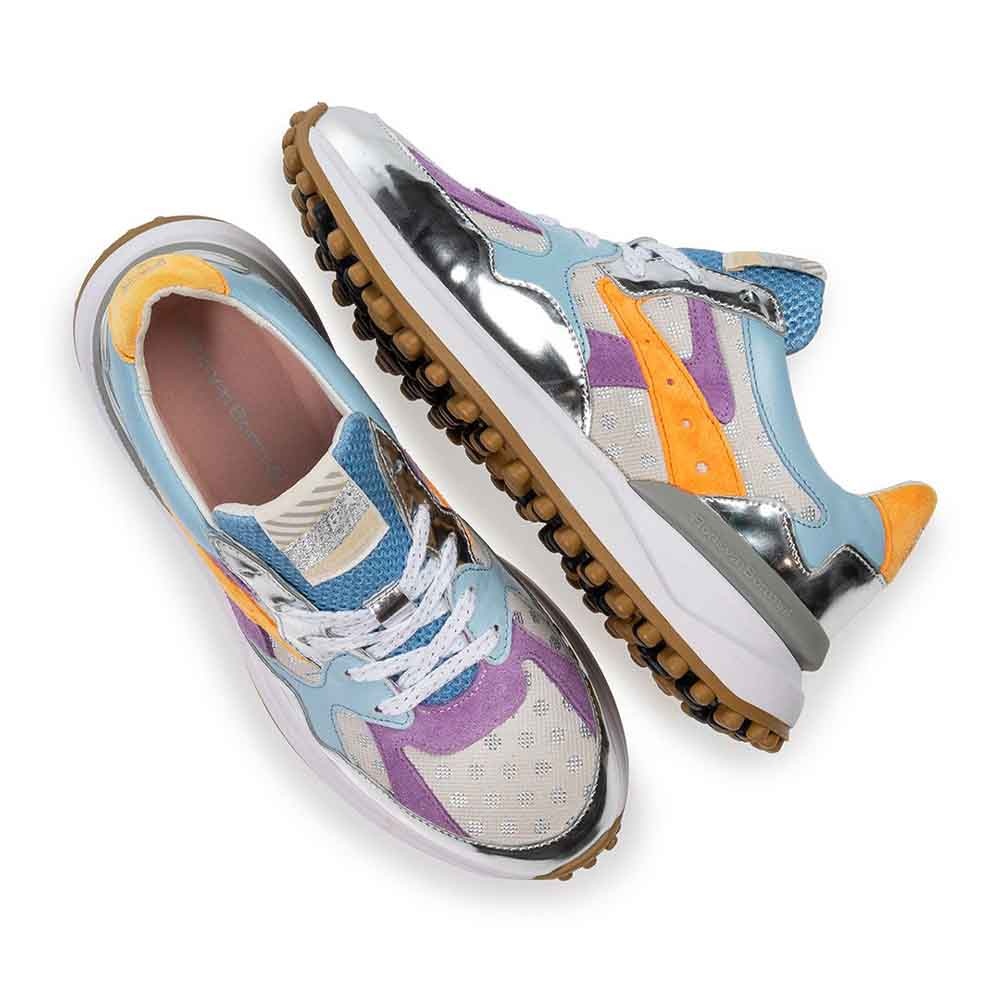De Floris van Bommel Noppi 46.07 in blauw en zilver is een opvallende dames sneaker, perfect voor de zomer. De sneaker valt direct op door de speelse details in lichtgroen en roze met stippen. Dit maakt hem ideaal voor vrouwen die houden van een vrolijke en stijlvolle look, zowel casual als trendy.