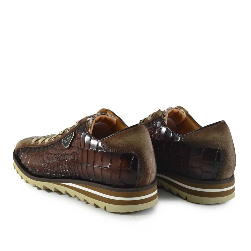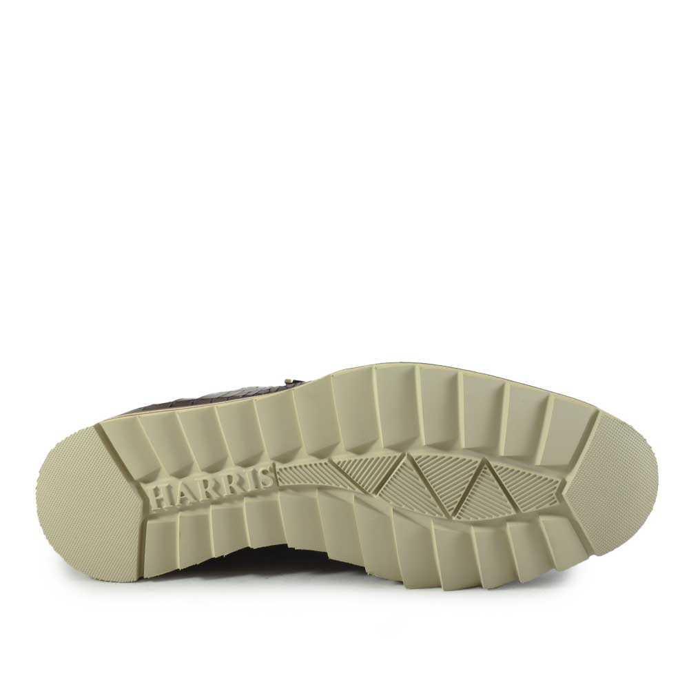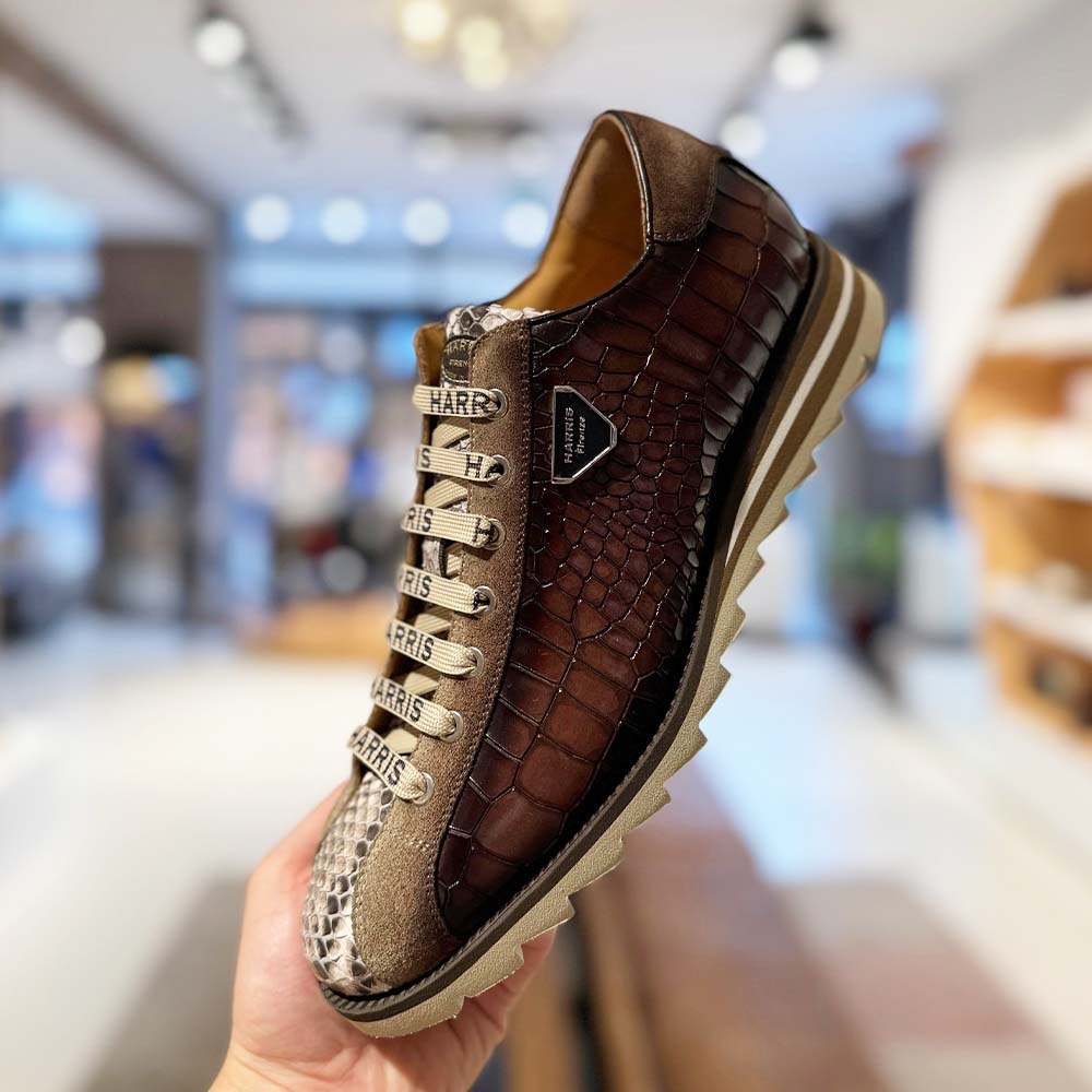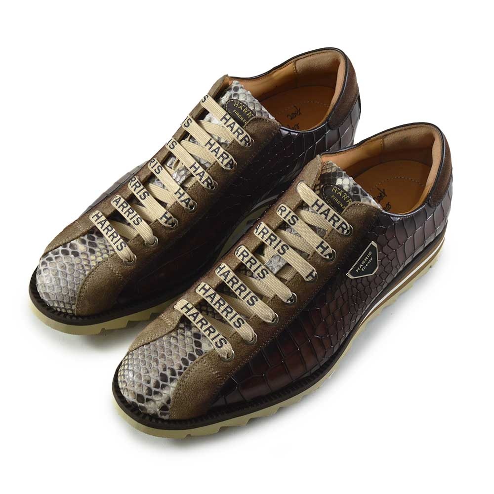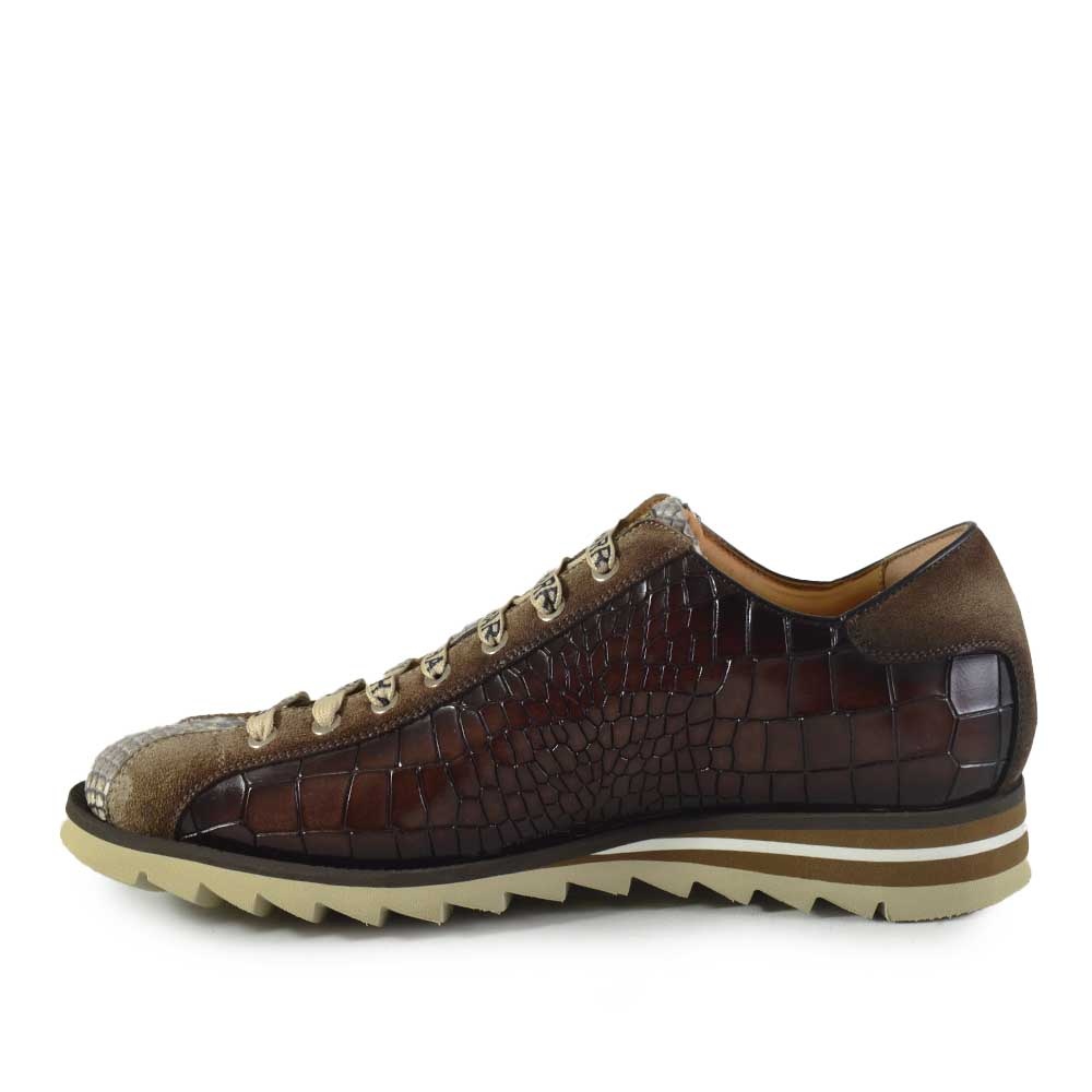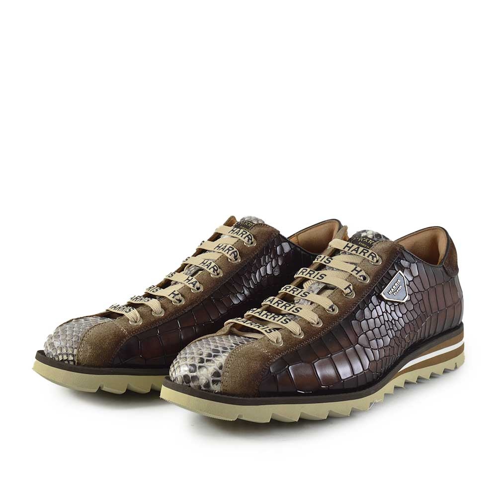 De Harris Opaco Bruin heren sneaker is een waar kunstwerk voor de stijlvolle man. Deze luxe sneaker combineert glanzend krokodillenleer met subtiel slangenleer op de neus, wat zorgt voor een opvallend en exclusief design. De bruintinten geven de schoen een warme, klassieke uitstraling, terwijl het materiaalgebruik garant staat voor pure luxe.