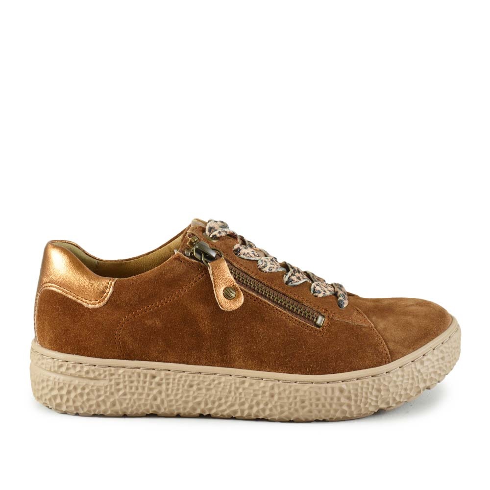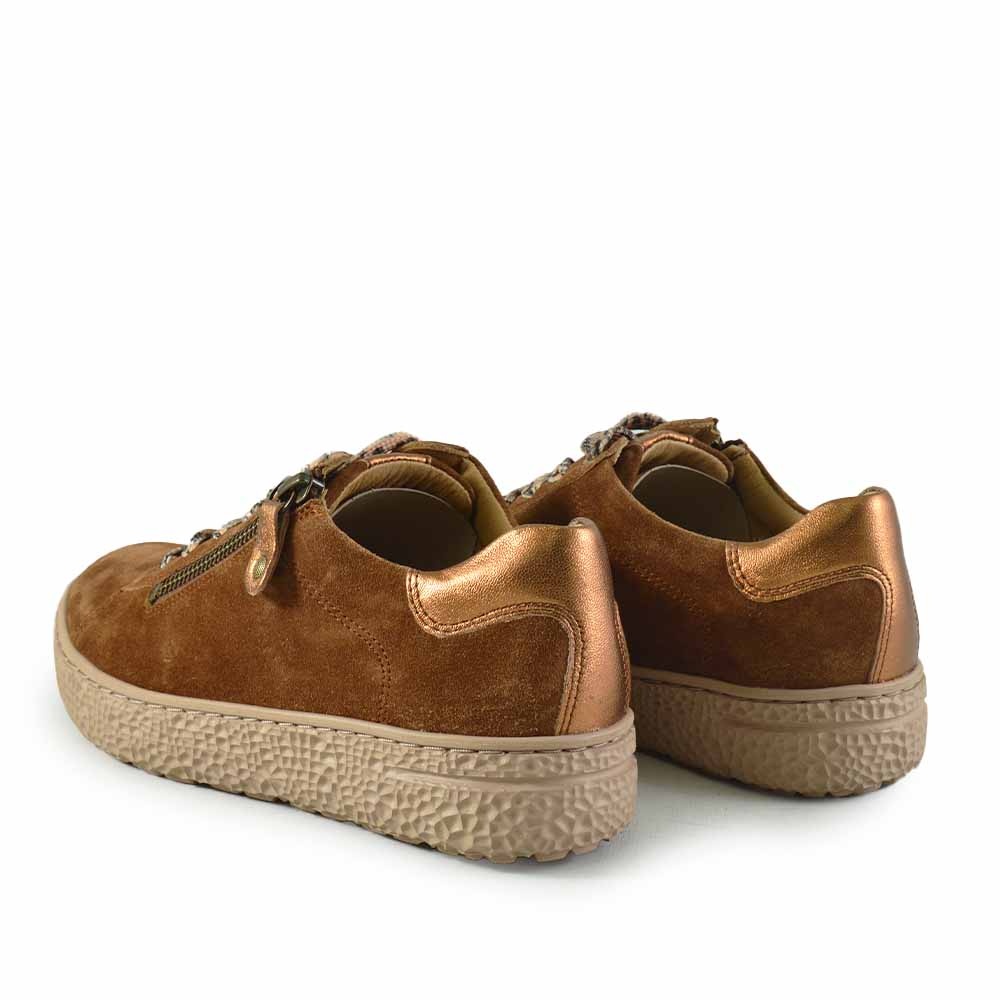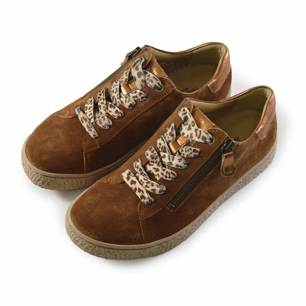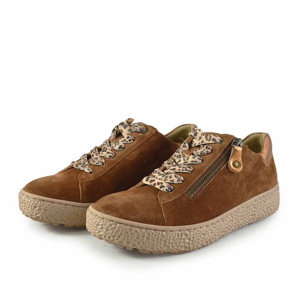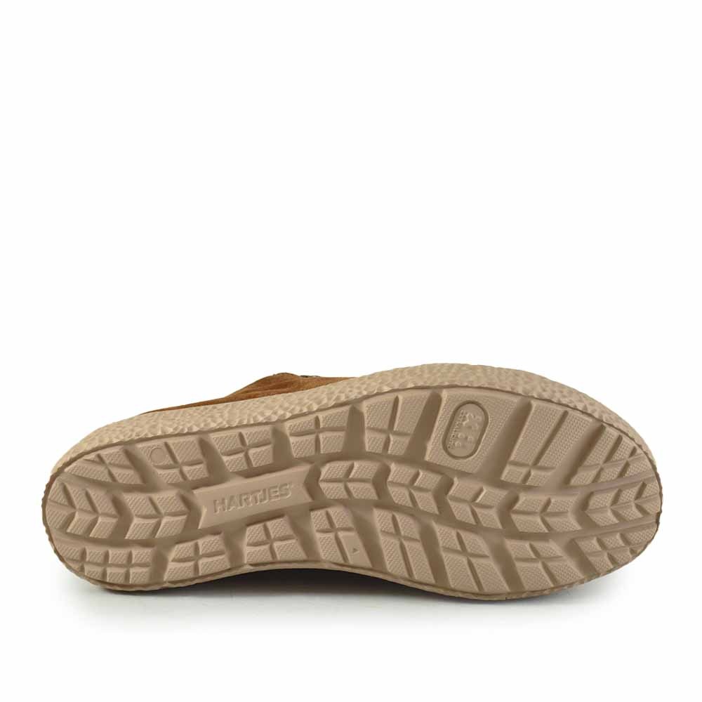 De Hartjes Phil Shoe in cognac suede combineert ultiem comfort met een stijlvolle uitstraling. Dankzij de H-breedtemaat is deze sneaker perfect voor dames met een bredere voet. De lichtgewicht rechte beige zool zorgt voor een natuurlijke afwikkeling van de voet en een fijn loopcomfort, de hele dag door.