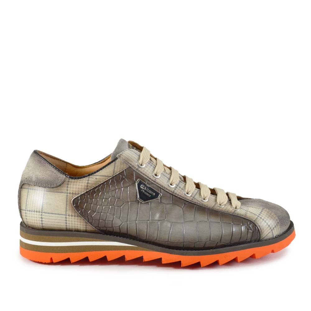 De Harris Piuma Grijs heren sneaker is een waar meesterwerk voor de liefhebber van luxe en detail. Deze handgemaakte Italiaanse sneaker straalt klasse uit met zijn combinatie van krokodillenleer look, geruite stoffen details en stijlvolle grijze tinten. Elk paar wordt met zorg vervaardigd in Italië, waarbij kwaliteit en pasvorm centraal staan.
