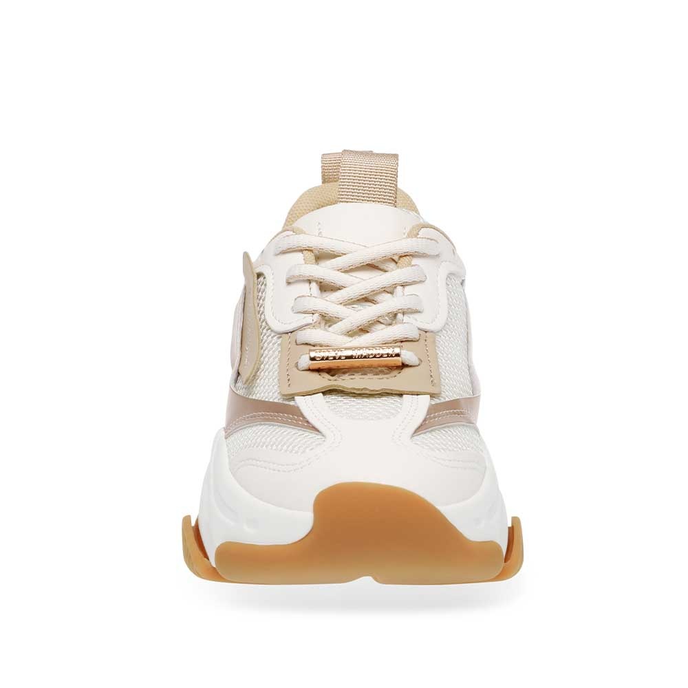 Steve Madden Possession-E dames sneaker in goud-beige met chunky zool. Stijlvol, comfortabel en perfect voor elke zomerse outfit.