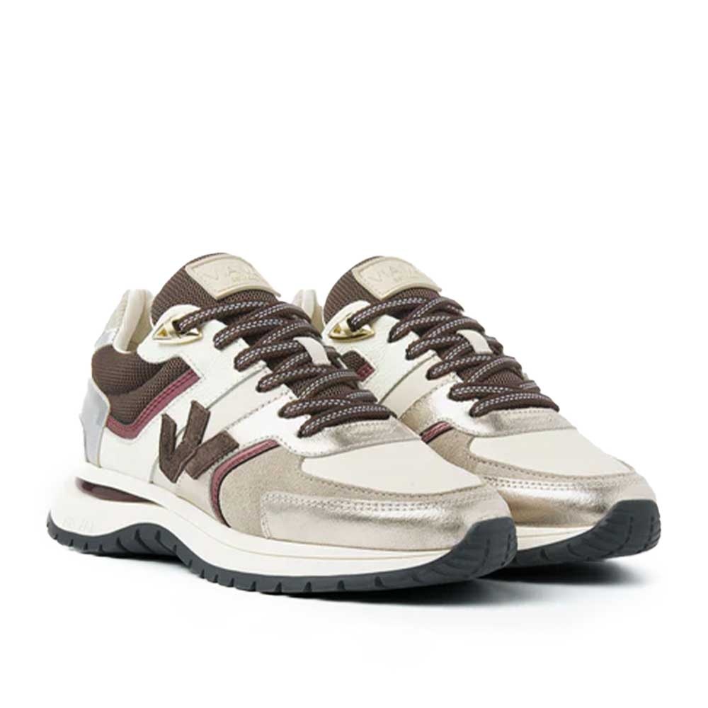 De Via Vai Usher Davina Goud Beige dames sneaker is een echte eyecatcher. De modieuze kleurcombinatie van goud-beige met bordeaux en bruine details geeft deze sneaker een luxe uitstraling. Of je nu kiest voor een casual look of een chique outfit, deze sneaker past moeiteloos bij elke stijl.